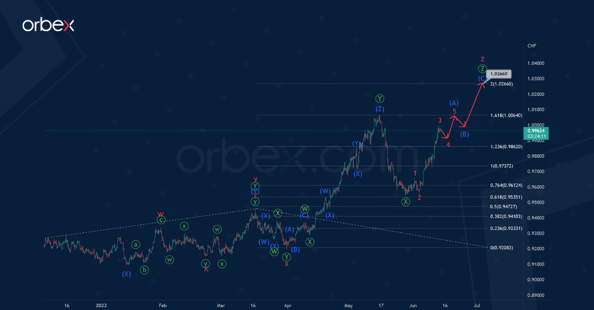 In the near future, the development of the primary impulse wave Ⓒ is likely. It could end at the price level of 0.947, where it will be equal to the first impulse wave Ⓐ.