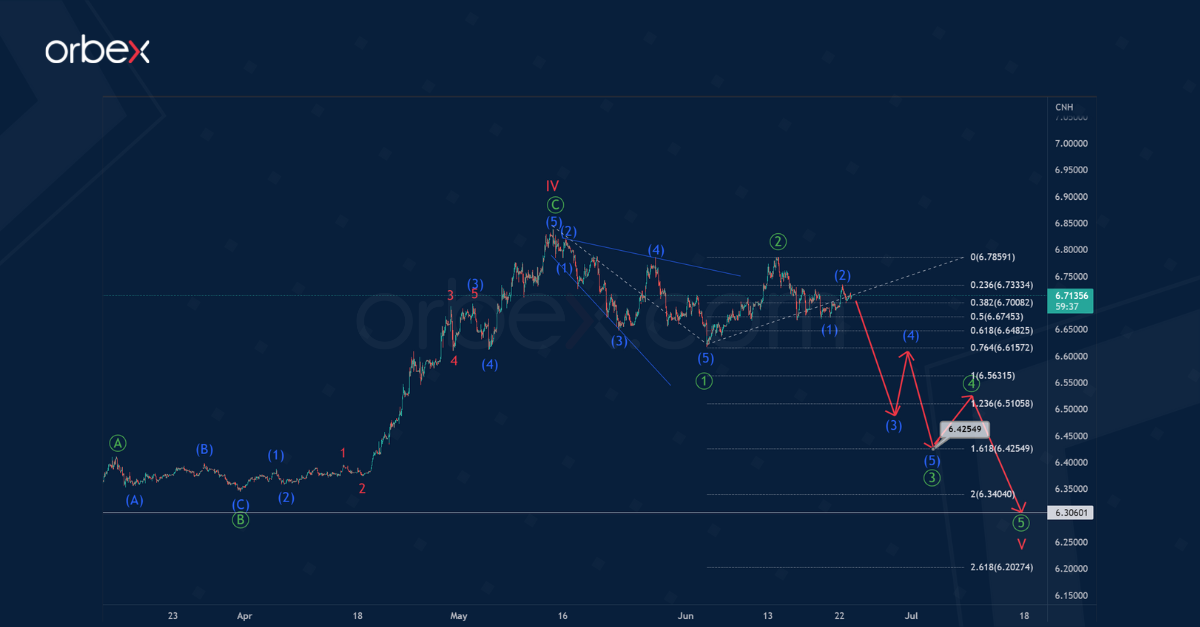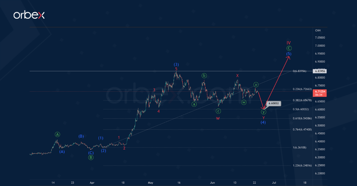 The internal structure of the USDCNH pair hints at the primary zigzag pattern Ⓐ-Ⓑ-Ⓒ. In the long term this forms a cycle correction IV.
