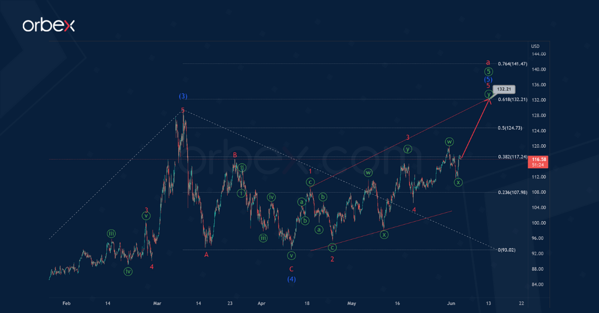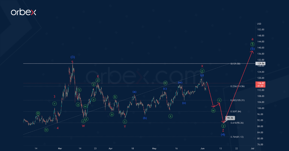 The oil price could fall to 90.36. At that level, intermediate correction (4) will be at 61.8% of impulse (3).
