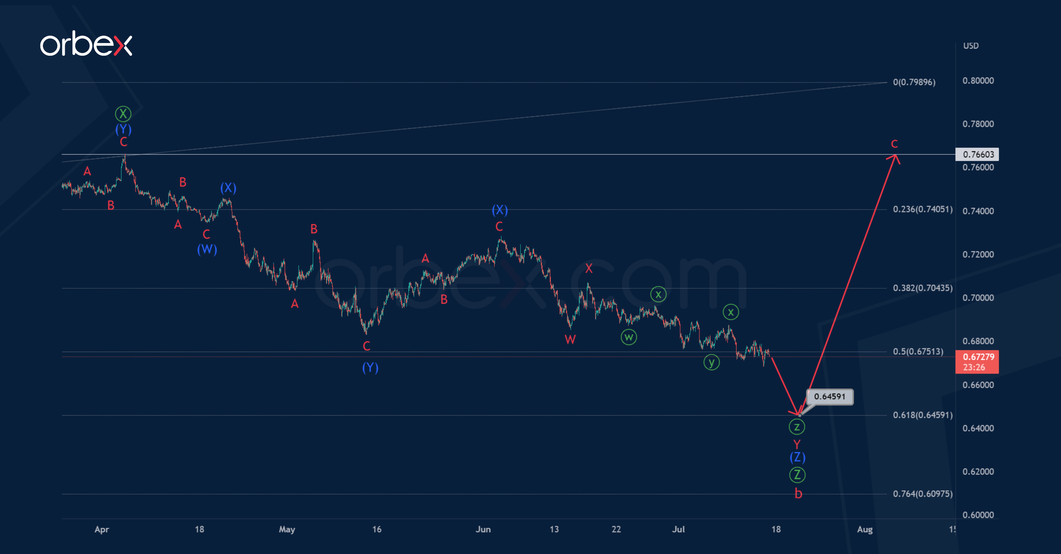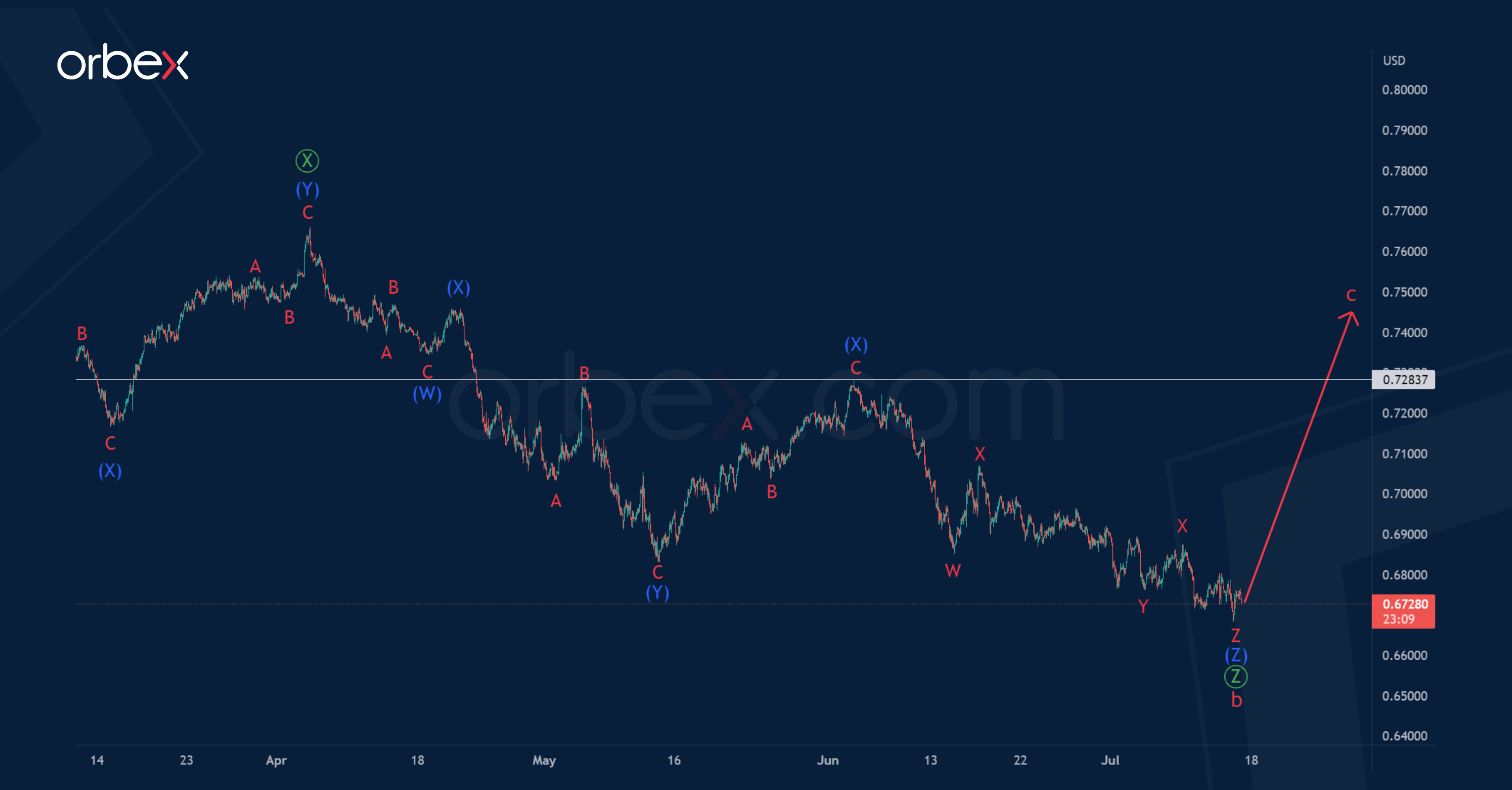 The current structure of the AUDUSD pair suggests the formation of a zigzag a-b-c. This currently includes a bearish correction b and consists of primary sub-waves Ⓦ-Ⓧ-Ⓨ-Ⓧ-Ⓩ.
