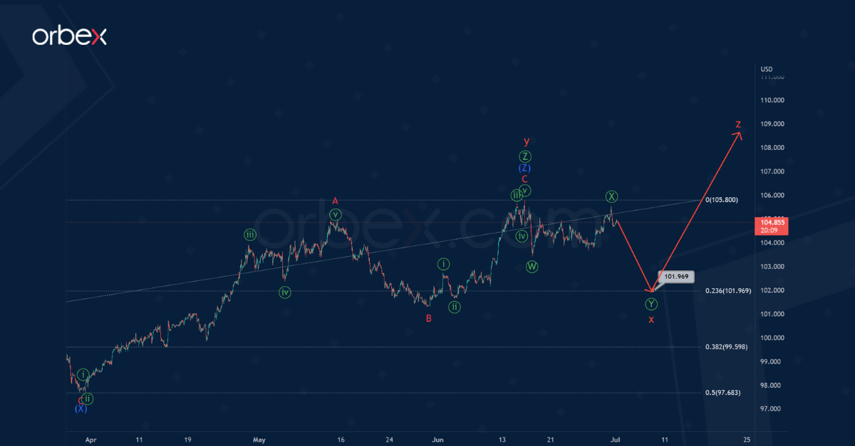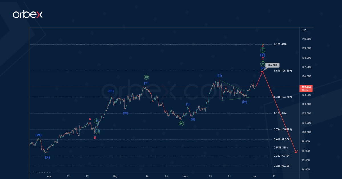 Price could continue higher to the level of 106.58. At that level, wave z will be at 161.8% of previous actionary wave y.