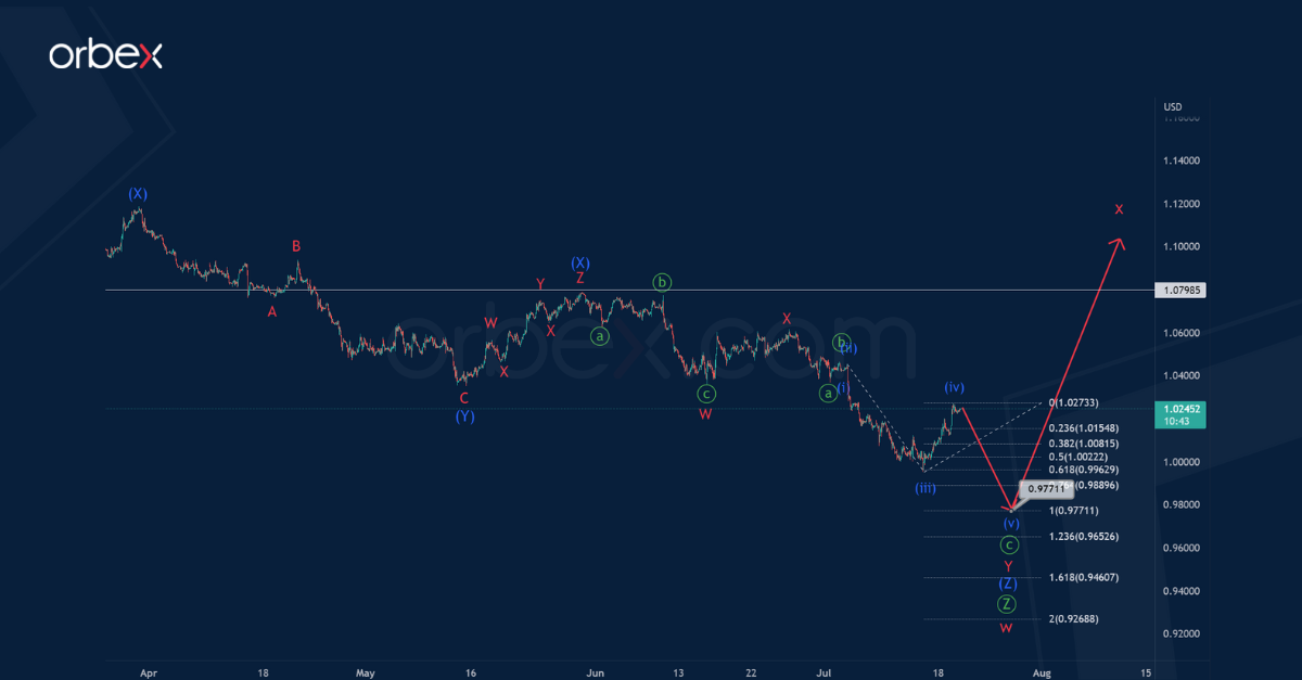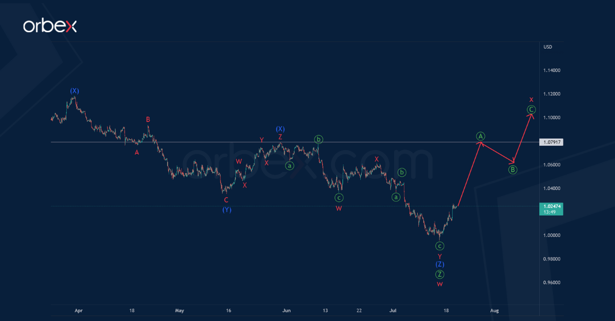 In the long term, the EURUSD pair eyes a bearish corrective trend. This could be a double zigzag consisting of cycle waves w-x-y.