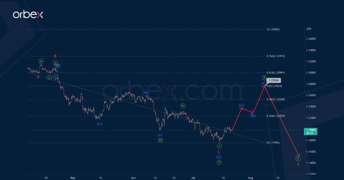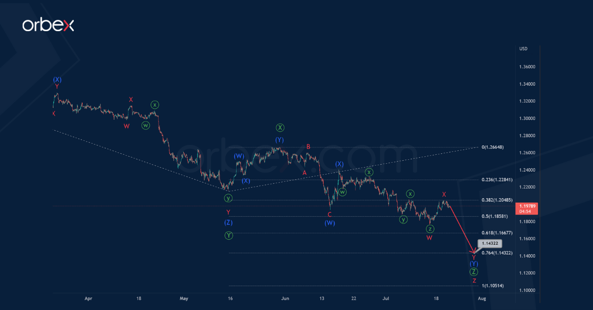 It is likely that in the near future the bearish trend will continue in the primary wave Ⓩ. This could complete its intermediate double zigzag (W)-(X)-(Y) pattern near the 1.143 mark. The intermediate wave (W) can also take the form of a double zigzag W-X-Y.