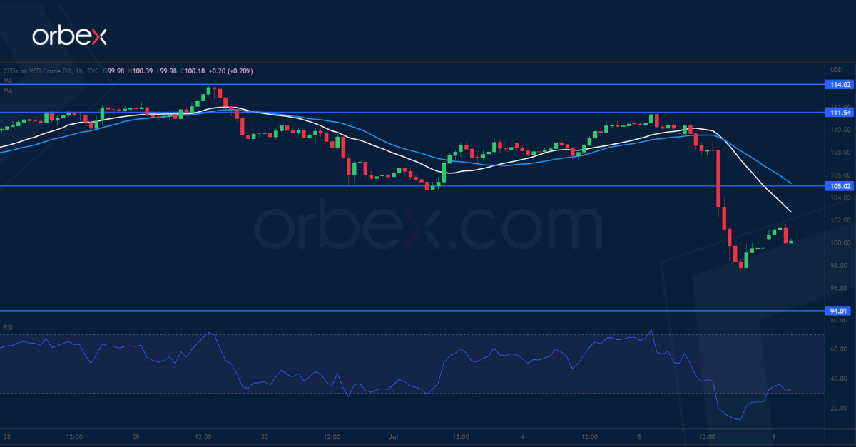 WTI crude plunges as the market lingers on concerns of slowing growth. A fall below 105.00 and a bearish MA cross on the daily chart have put the bulls on the defensive. The recent rally hit resistance at 111.50, which suggests a lack of conviction from the buy side. As the price became vulnerable to another round of sell-off, a clean cut through 104.70 and the daily support at 102.00 would bring in more momentum selling. 94.00 from March’s lows is the next support while 105.00 has turned into a fresh resistance.