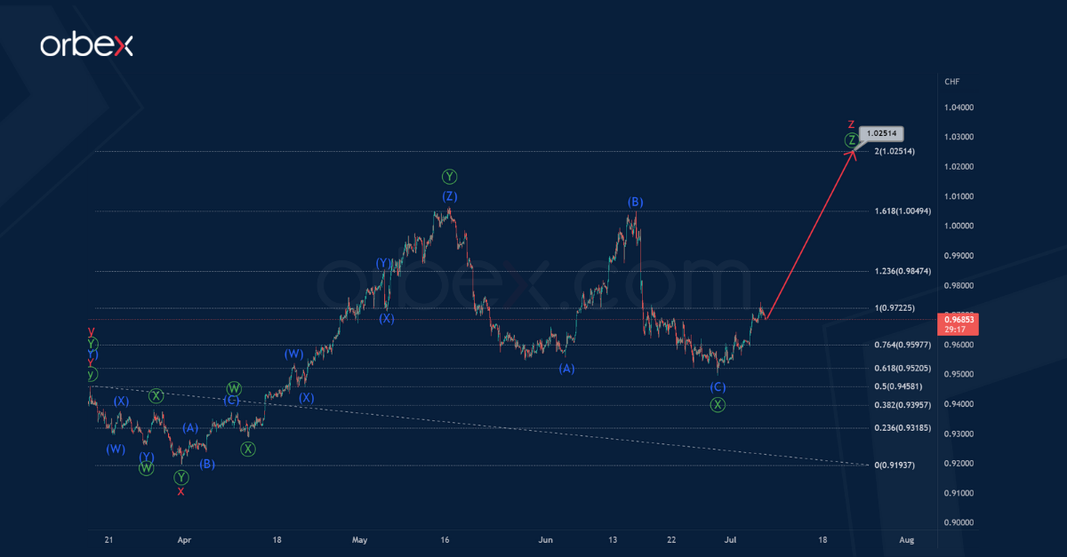 It is likely that the development of the primary intervening wave Ⓧ has come to an end, within which the price has significantly decreased. It is similar to a zigzag (A)-(B)-(C) of the intermediate degree. In the last section of the chart, we see that the upward movement has begun in the first part of the actionary wave Ⓩ.