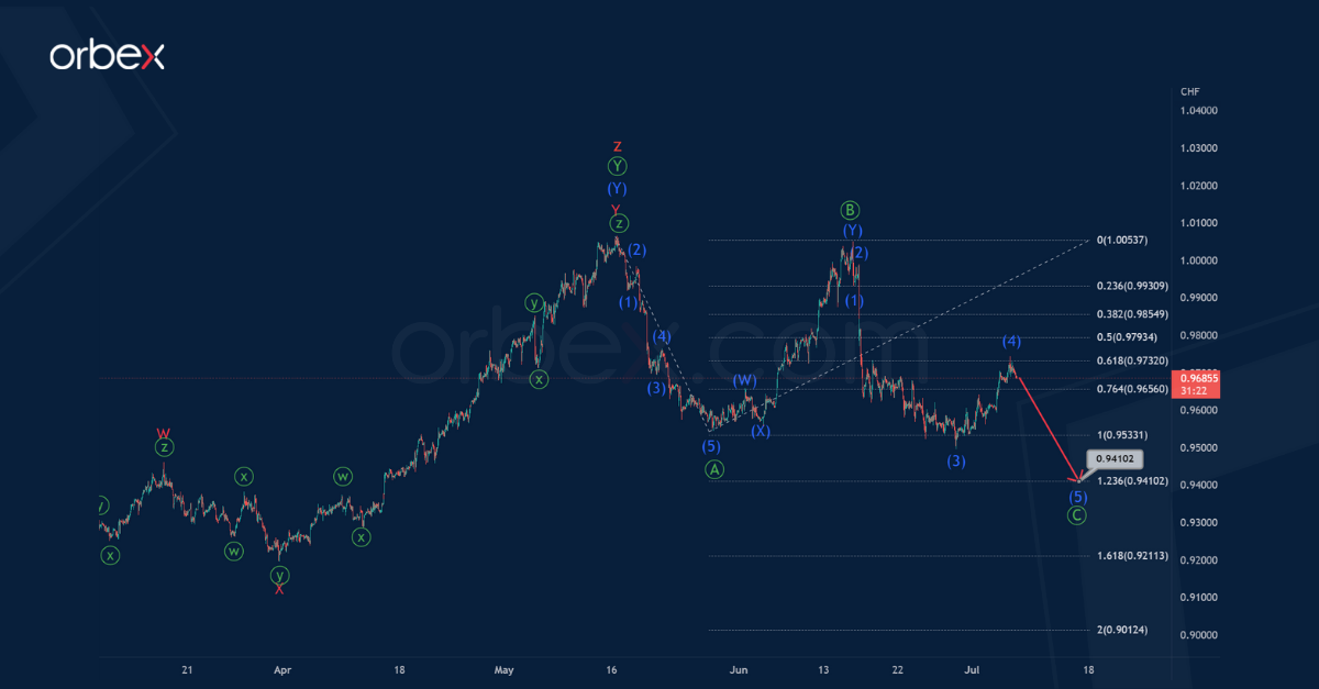 The structure of the USDCHF currency on the 1h timeframe shows the final part of a large triple zigzag consisting of cycle sub-waves w-x-y-x-z.