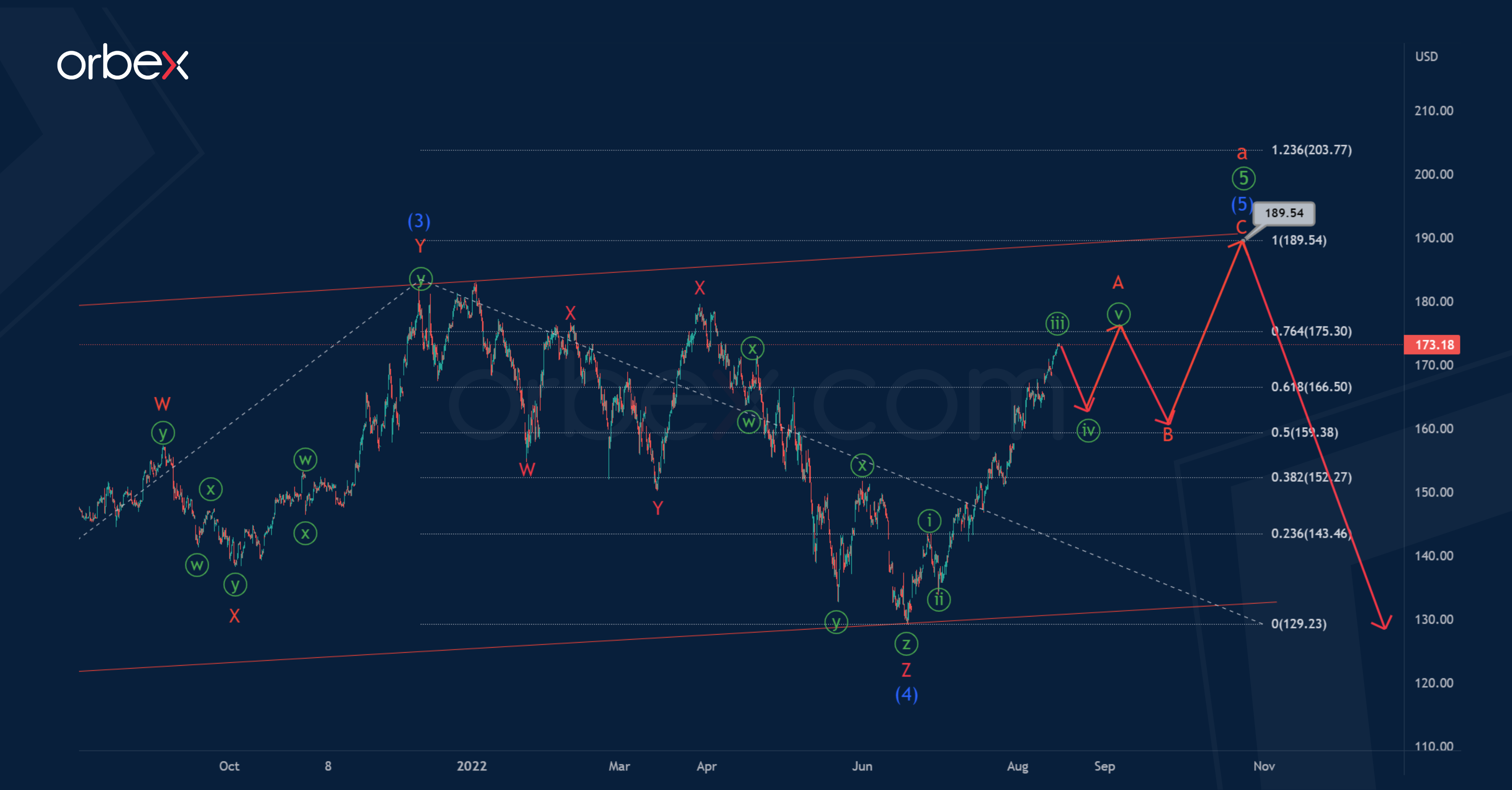 The current structure of AAPL shares suggests the development of the primary fifth wave, taking the form of an ending diagonal (1)-(2)-(3)-(4)-(5) of the intermediate degree. The wave ⑤ is the last part in the large cycle impulse a.