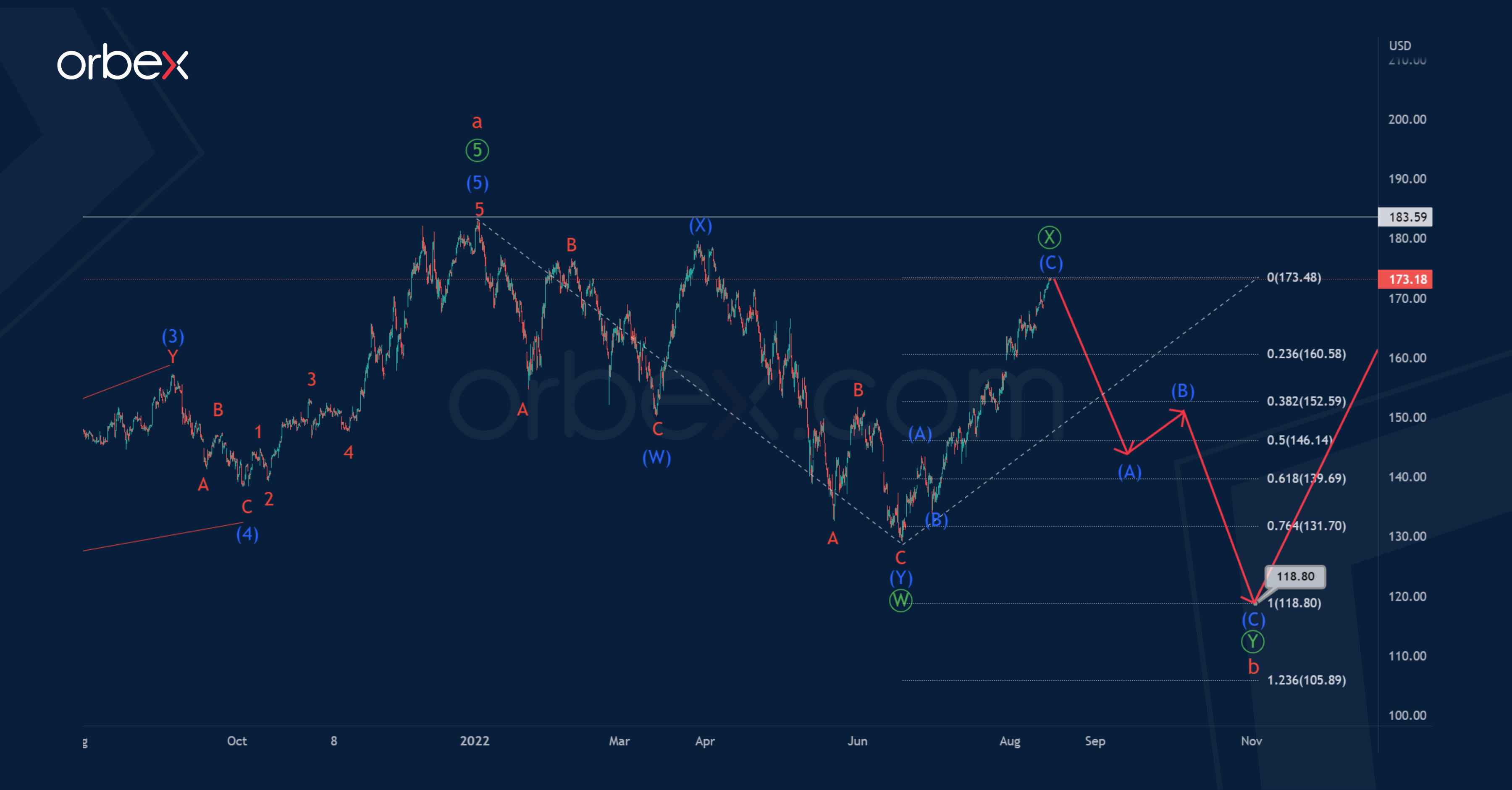 Thus, at the time of writing the review, we see a downward corrective movement of the stock price in a cycle wave b, which can take the form of a double zigzag Ⓦ-Ⓧ-Ⓨ of the primary degree. It seems that the first two primary sub-waves Ⓦ-Ⓧ have already been formed.