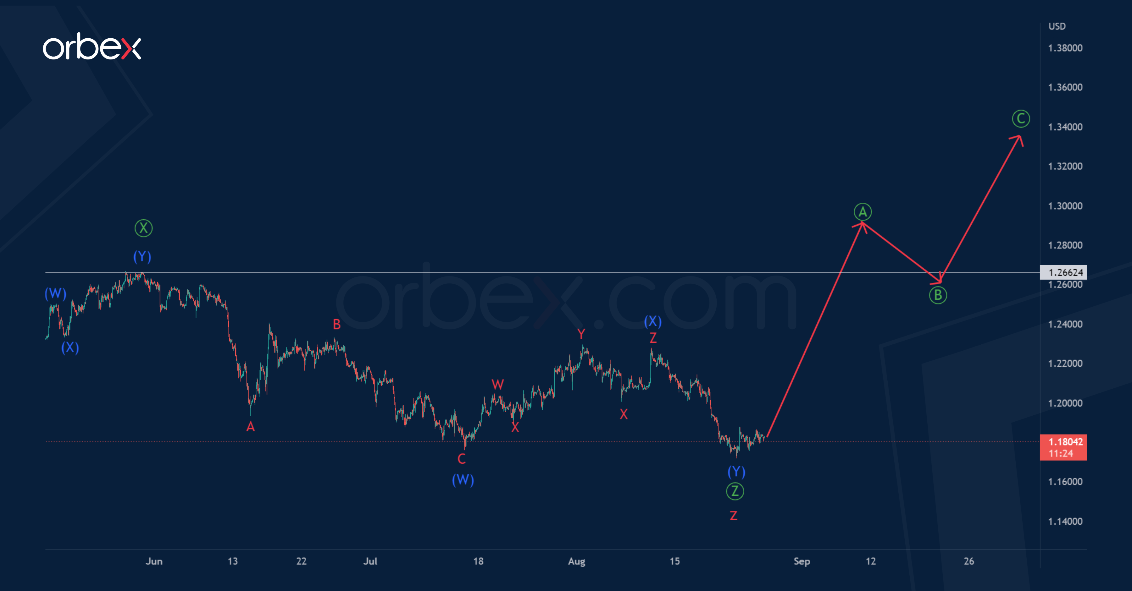 Wave z most likely takes the form of a primary triple zigzag Ⓦ-Ⓧ-Ⓨ-Ⓧ-Ⓩ. At the beginning of August, the bullish price movement within the primary intervening wave Ⓧ ended. This took the form of an intermediate zigzag (A)-(B)-(C).