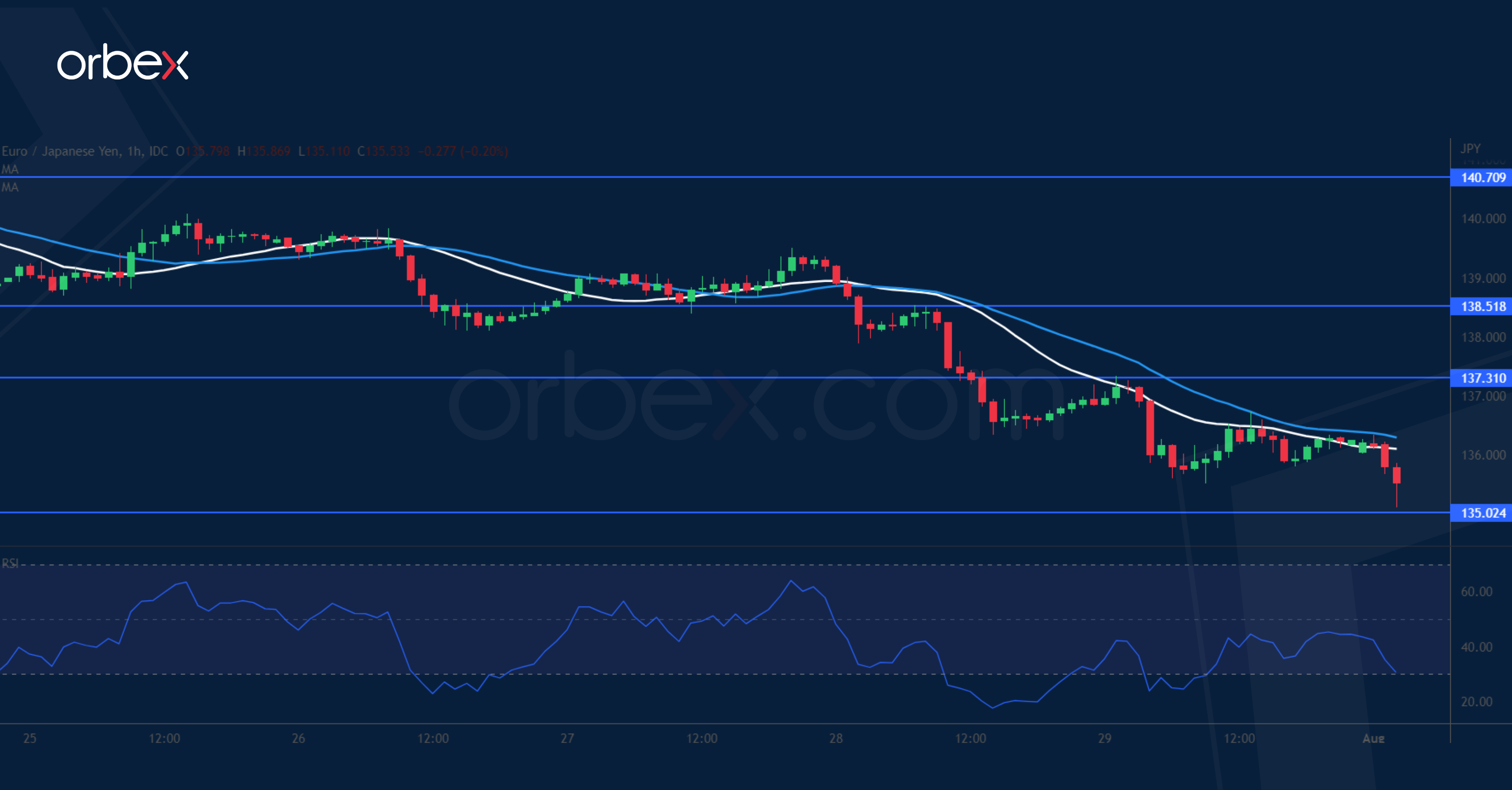The Japanese yen bounces back as profit-taking turns into a short squeeze. A break below 137.00 has triggered a new round of sell-off, invalidating the July rebound in the process. 135.00 at the origin of the breakout rally in late May is a key level to see whether there are still enough buyers in the market. Otherwise, 133.00 could be next. The RSI’s oversold condition may cause a limited rebound as intraday sellers take profit. Strong pressure could be expected around the support-turned-resistance at 137.30.