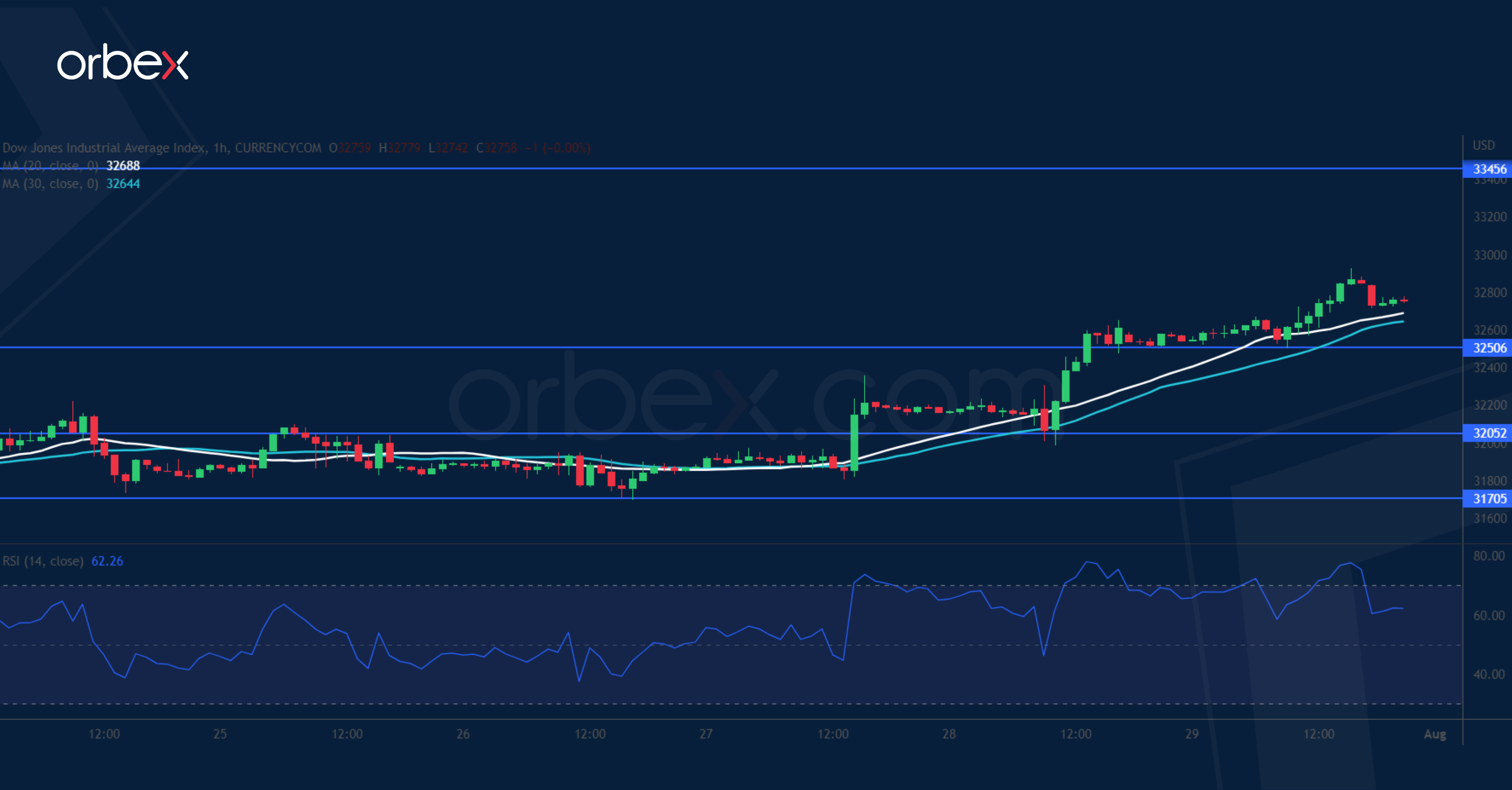The Dow Jones 30 rallies over expectations of slowing inflation. The index has found support in the former supply zone around 31700, which indicates the bulls’ strong commitment in extending the current recovery. As the index claws back last month’s losses, June’s high at 33450 is a major ceiling and a bullish breakout could ease the downward pressure in the medium-term. As the RSI rises back into the overbought area, intraday buyers may start to take profit, causing a pullback. 32500 is a fresh support should this happen.