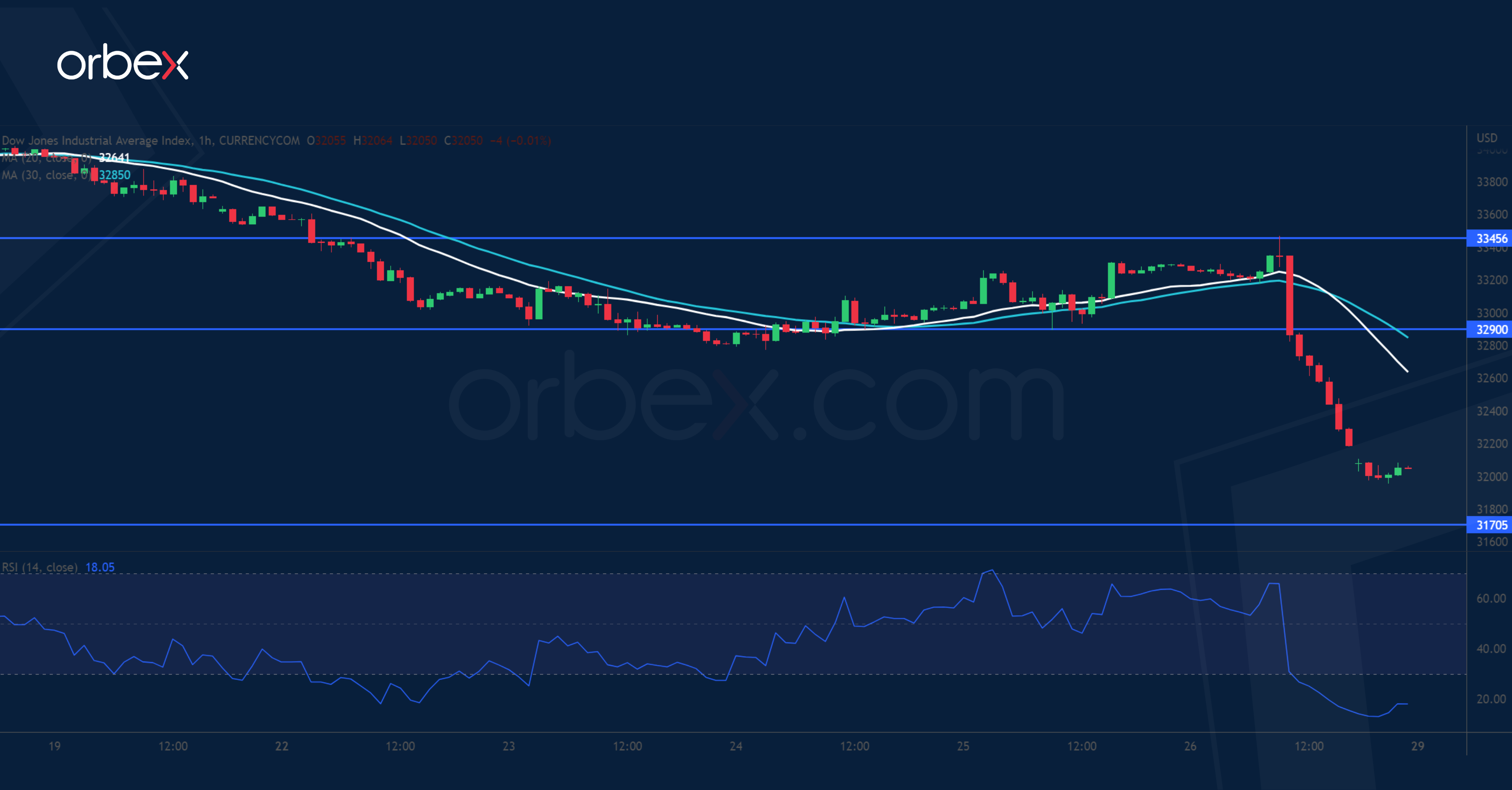 Equities tumbled after the US Fed shattered hopes that policymakers might dial back the tightening. The Dow Jones 30 lost its momentum after hitting a four-month high at 34300. An initial drop below 33850 led some leveraged positions to close out. Then the selling intensified after the index lost ground at 32800. 31700 could be the next stop. An oversold RSI may cause a temporary bounce and 32900 has become a fresh supply zone where the bears could be expected to fade the next rebound.