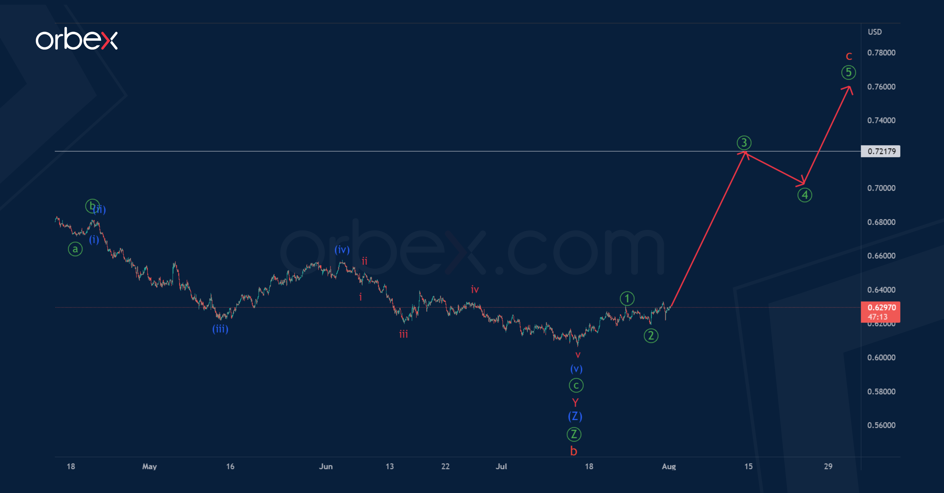 Thus, in the next coming trading weeks, the development of a bullish cycle wave c above 0.721 is possible. Wave c is likely to take the form of an impulse ①-②-③-④-⑤. At the specified price point, the construction of the primary impulse wave ③ is likely to end.