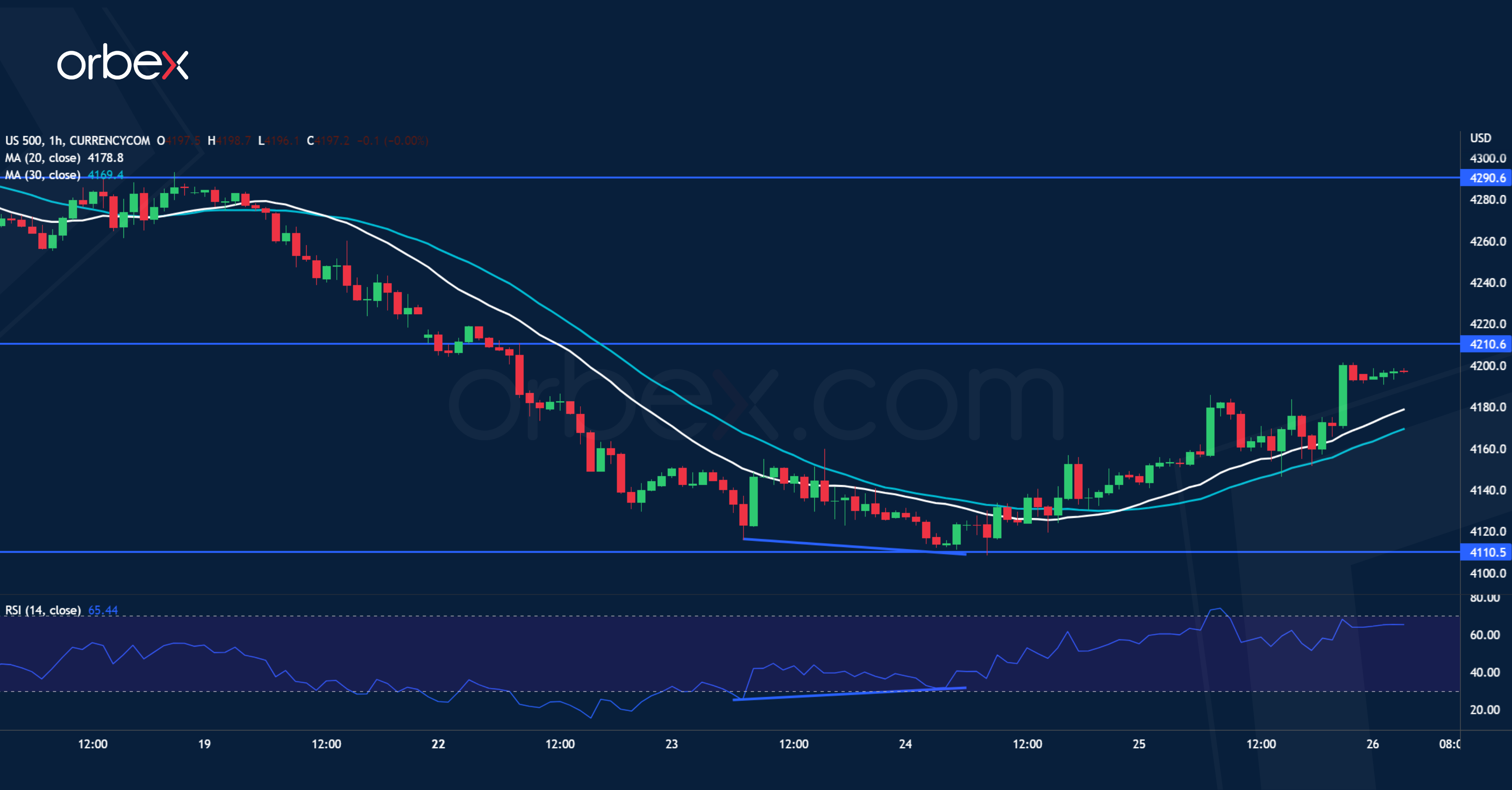 The S&P 500 bounces as the shorts take profit ahead of Powell’s speech. The recent sell-off has stopped short at 4110, which is a daily support at the base of a bullish breakout. The level also coincides with the 30-day moving average, making it a congestion area. A bullish RSI divergence attracted bargain hunters with an initial pop above 4160. The bulls will need to lift the support-turned-resistance at 4210 before the recovery could gain momentum. A bearish breakout could trigger a fall to the psychological level of 4000.