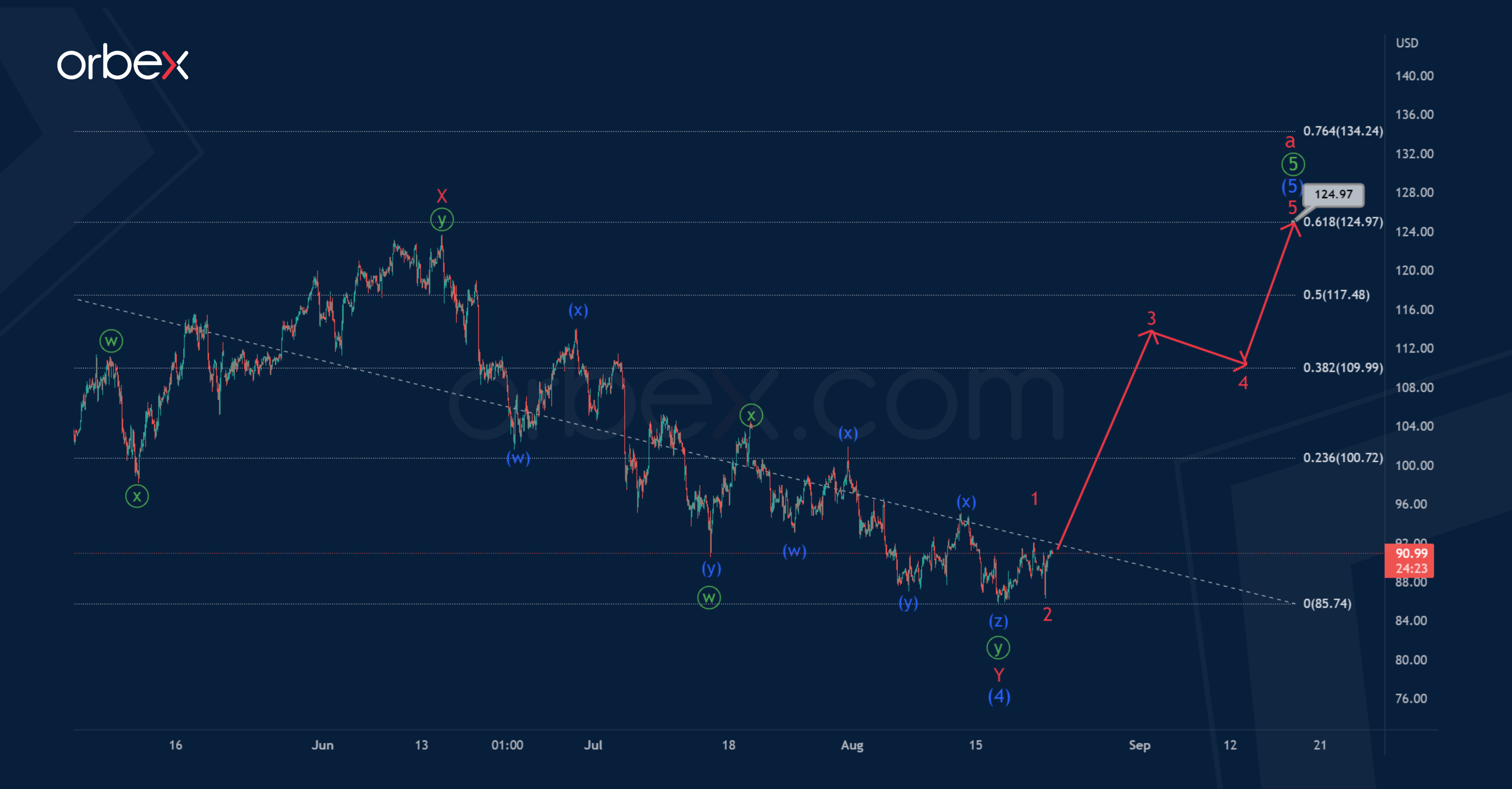 The oil price could fall to 81.08. At that level, intermediate correction (4) will be at 76.4% of impulse (3).