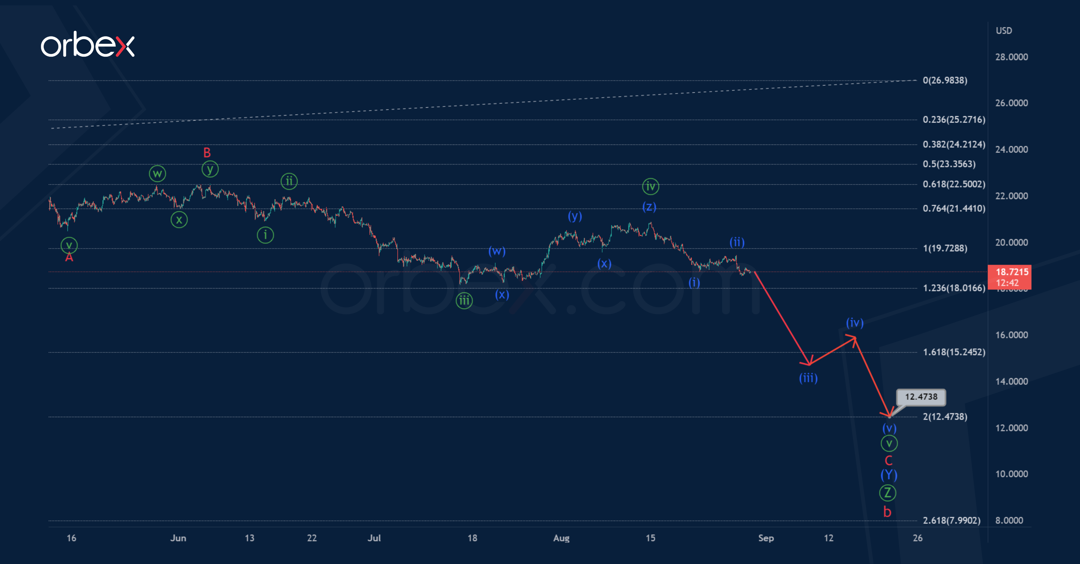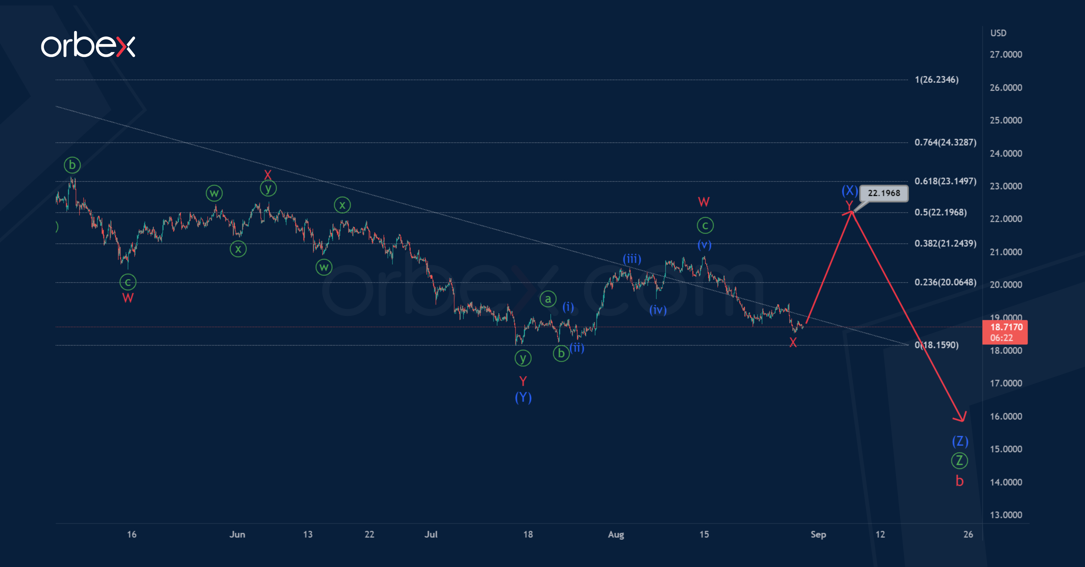 It can be assumed that the wave (X) will end as a minor double zigzag W-X-Y near 21.169. At that level, it will be at 50% of sub-wave (Y).