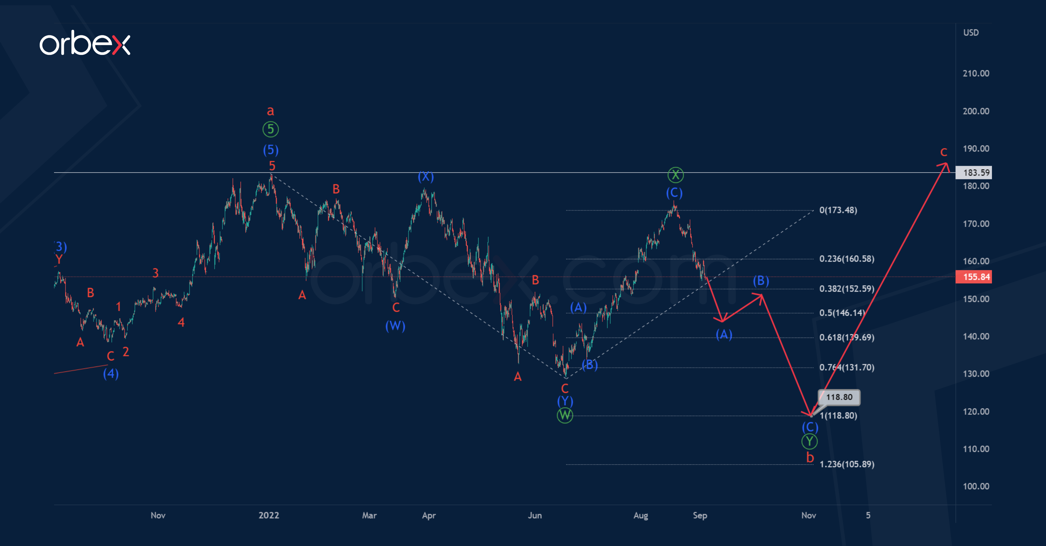 There is a high probability that the final sub-wave Ⓨ will bring the market to 118.80. At that level, primary wave Ⓨ will be at 100% of wave Ⓦ.
