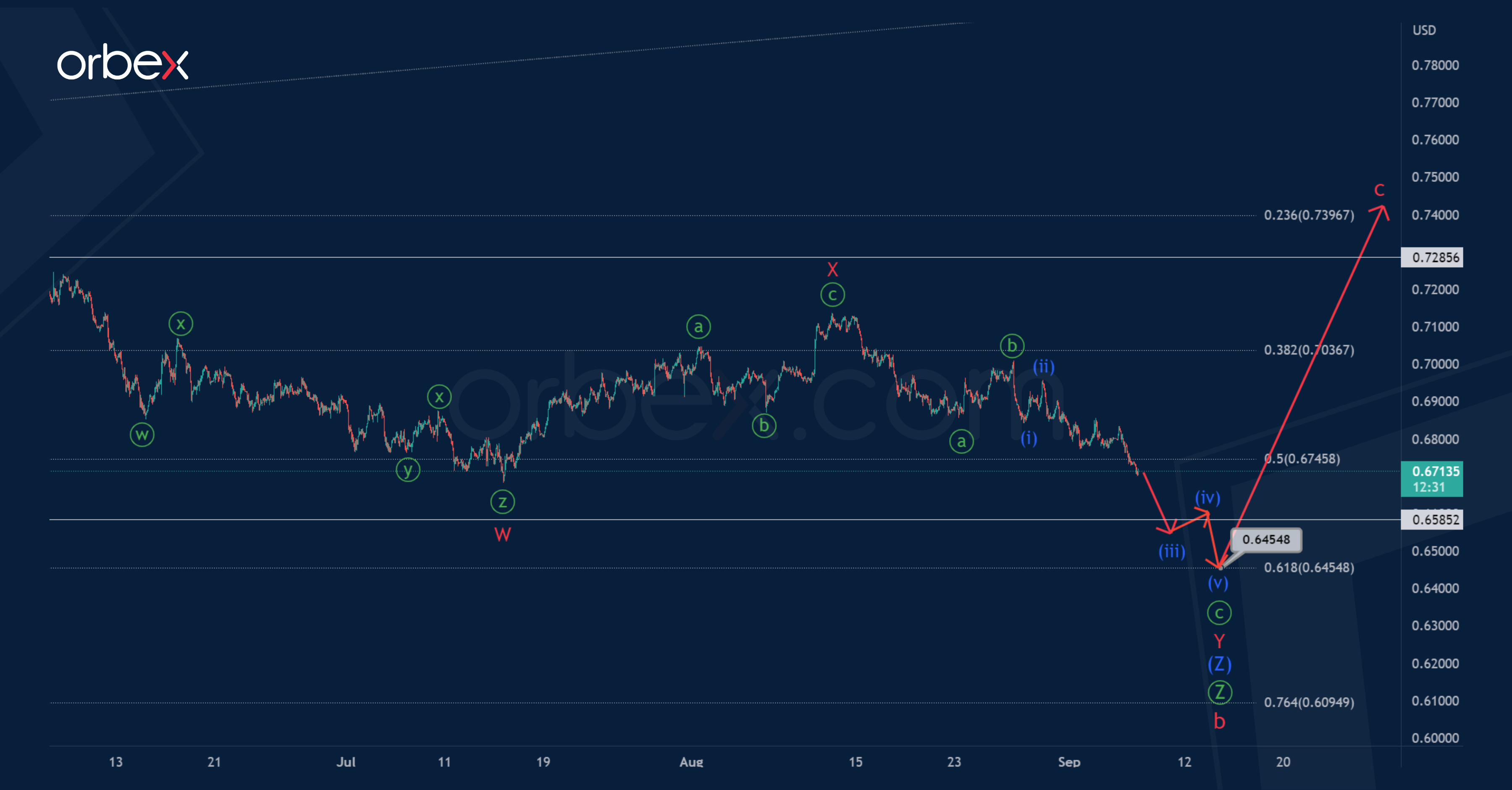 AUDUSD seems to be forming a zigzag a-b-c, which currently includes a complex bearish correction b. Wave b consists of primary sub-waves Ⓦ-Ⓧ-Ⓨ-Ⓧ-Ⓩ.