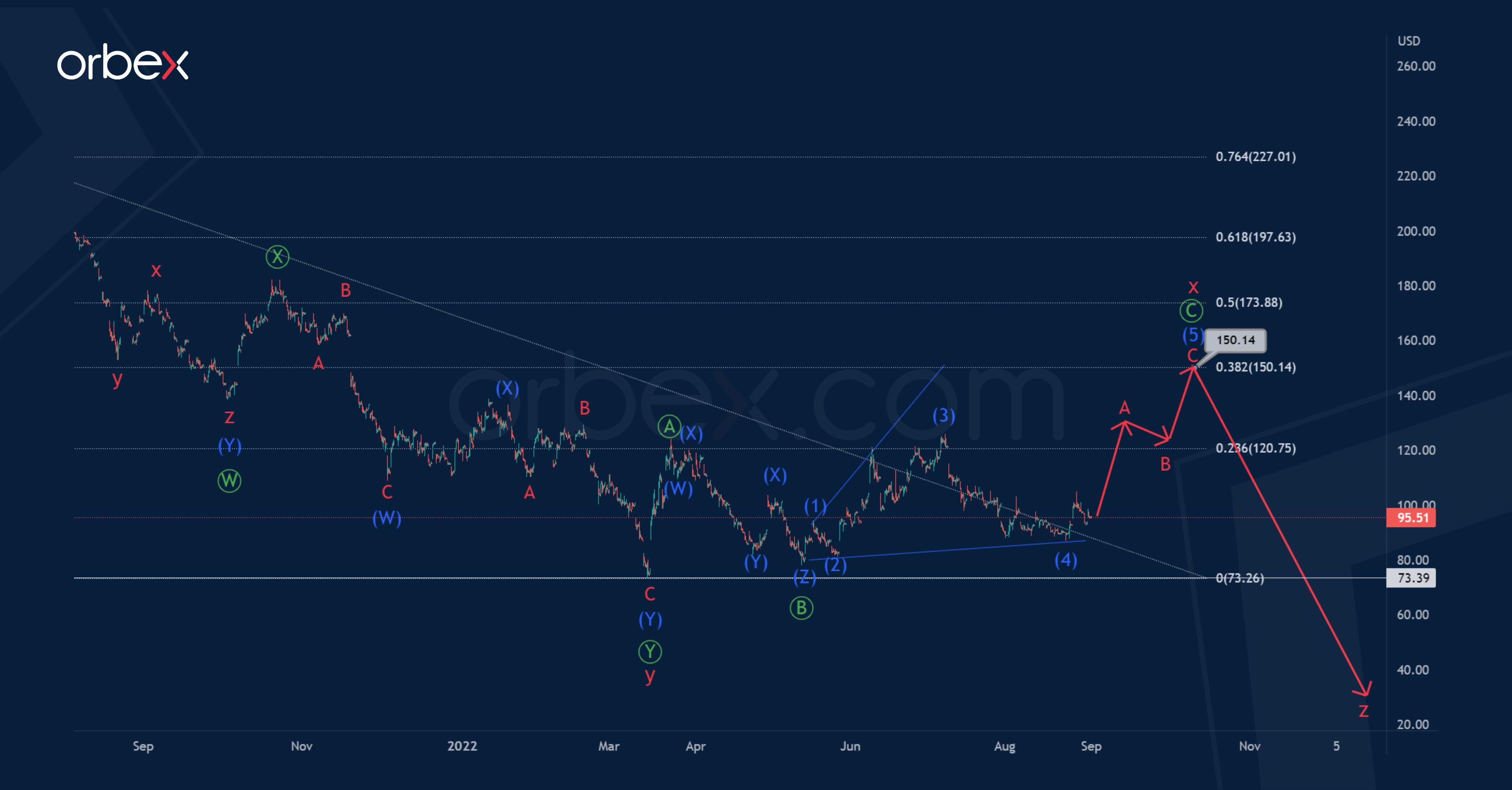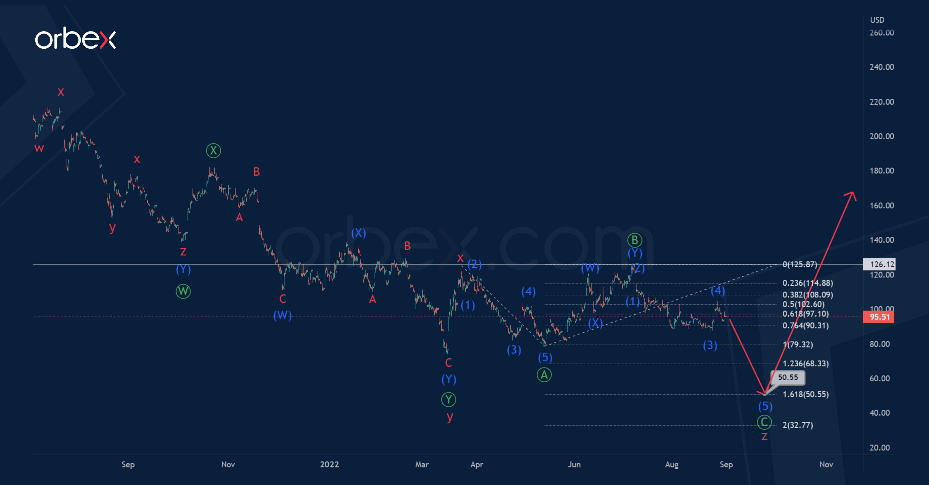 BABA suggests the formation of a bearish corrective trend, which takes the form of a cycle triple zigzag w-x-y-x-z.