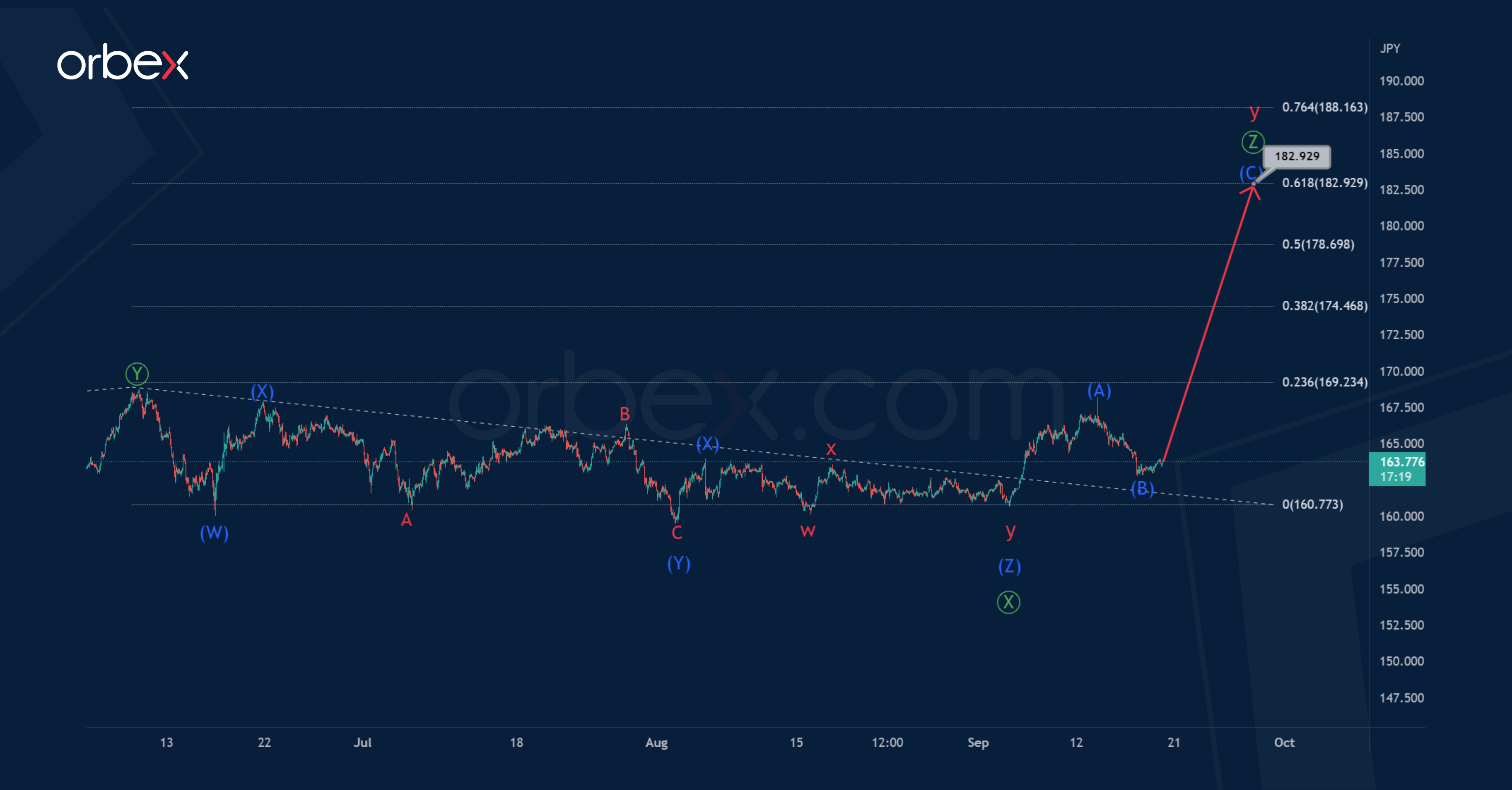 The completion of the entire wave Ⓩ is possible near 182.92. At that level, wave Ⓩ will be at 61.8% of wave Ⓨ.