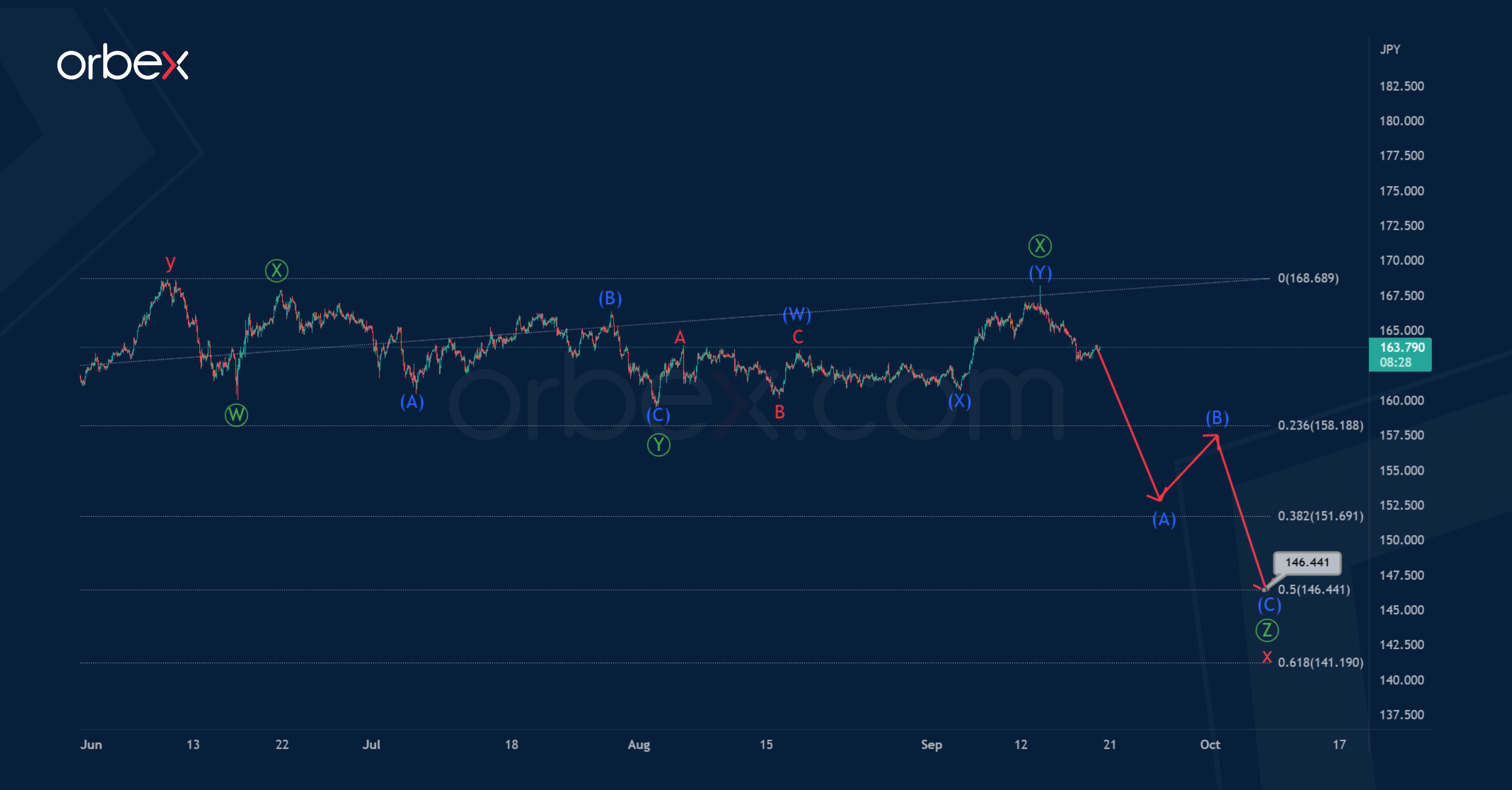 It is possible that the market will fall in the last wave Ⓩ to 146.44. At that level, cycle wave x will be at 50% of actionary wave y.