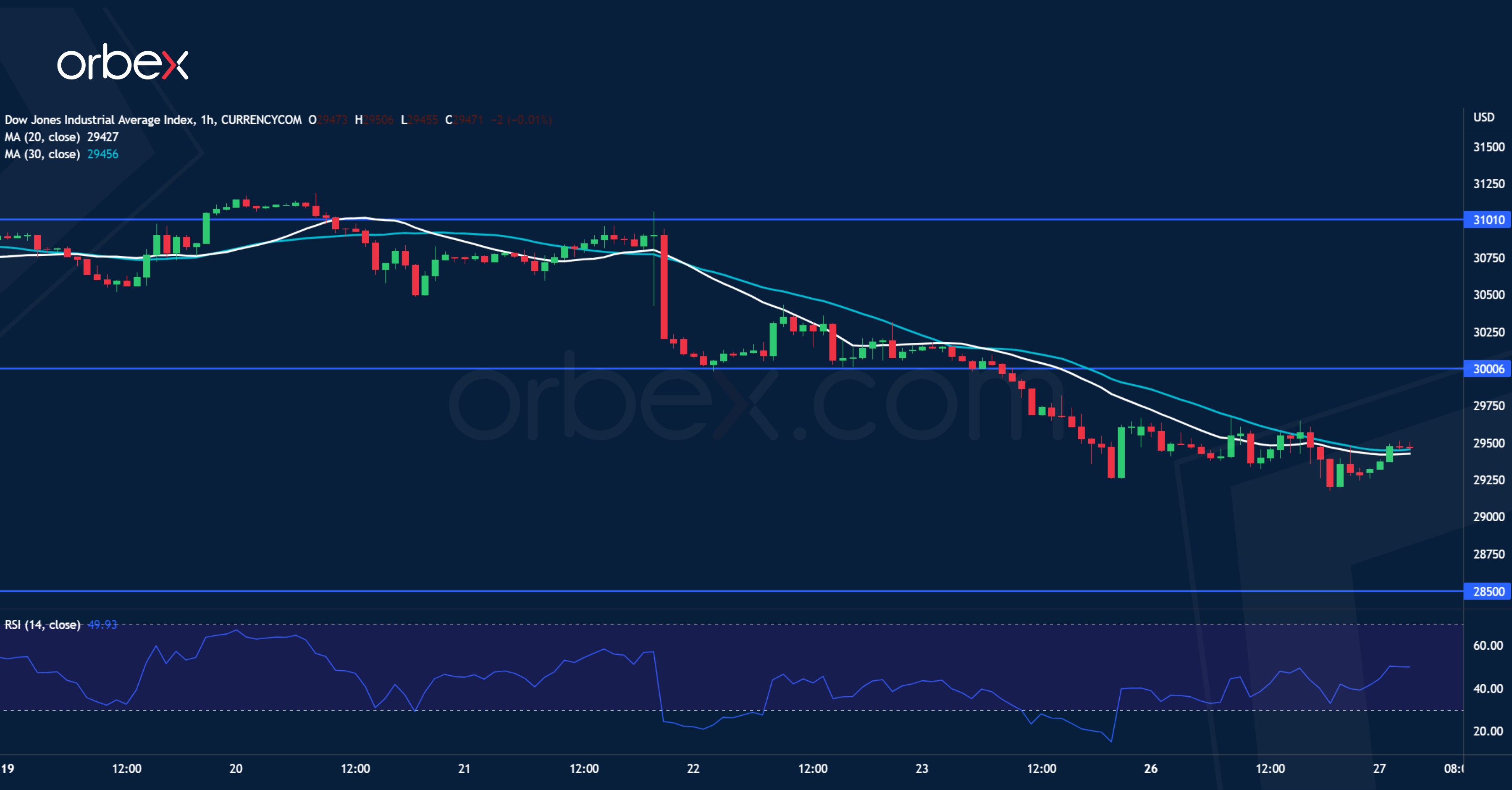 The Dow Jones 30 slips over concerns of a Fed tightening overdose. A break below June’s low at 29800 may have sealed the fate of the index by putting it on a bearish track. The breakout also confirms the bearish MA cross on the daily chart, indicating an acceleration to the downside. 28500 could be the next target. A brief bounce may draw more selling interests as the downtrend resumes its course, while trapped bulls may seek to bail out in the supply zone near the psychological level of 30000, exacerbating volatility in the process.