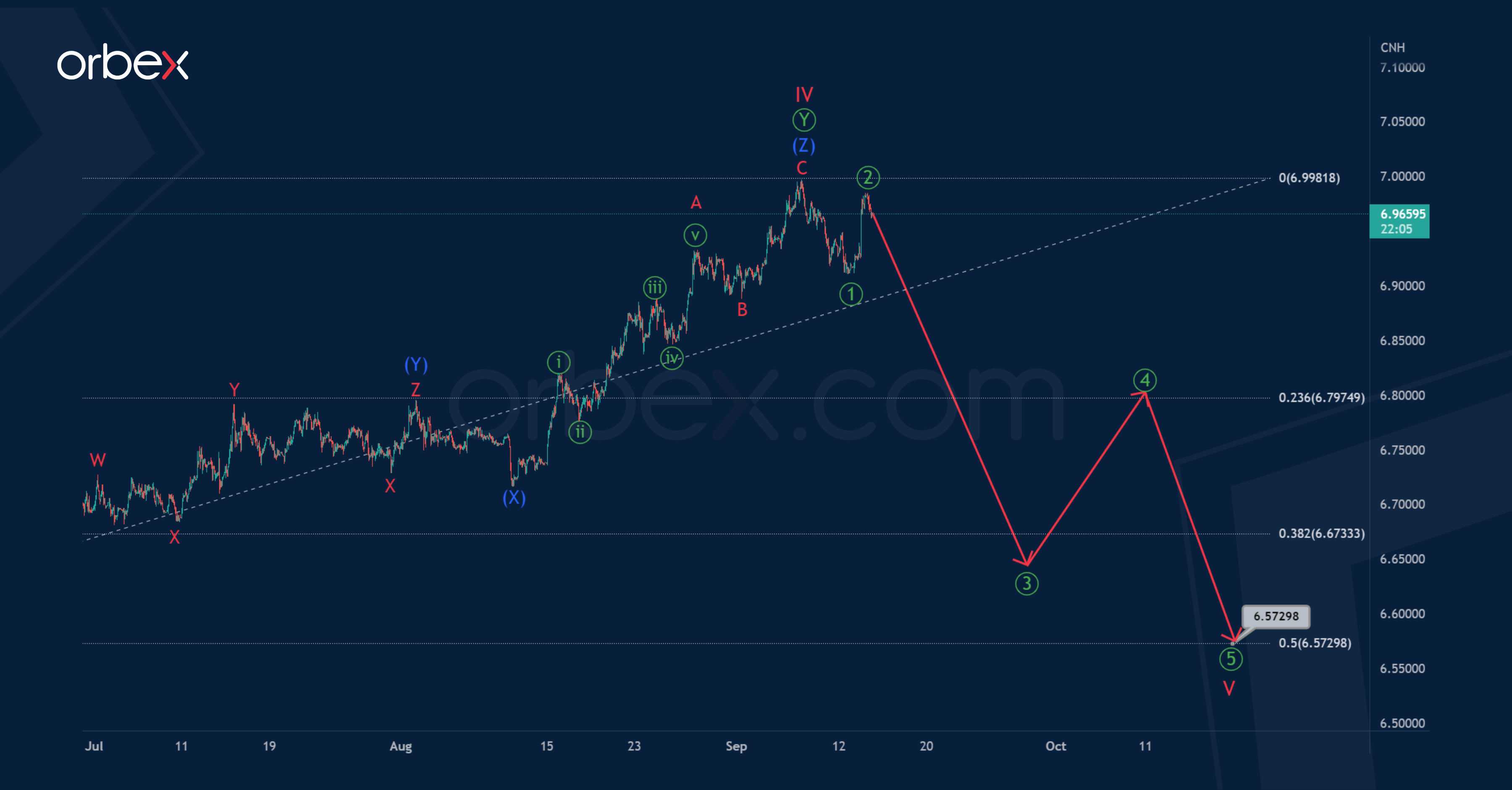 A look at the USDCNH pair shows a primary zigzag Ⓐ-Ⓑ-Ⓒ pattern. In the long term, this seems to be forming a large correction IV of the cycle degree.