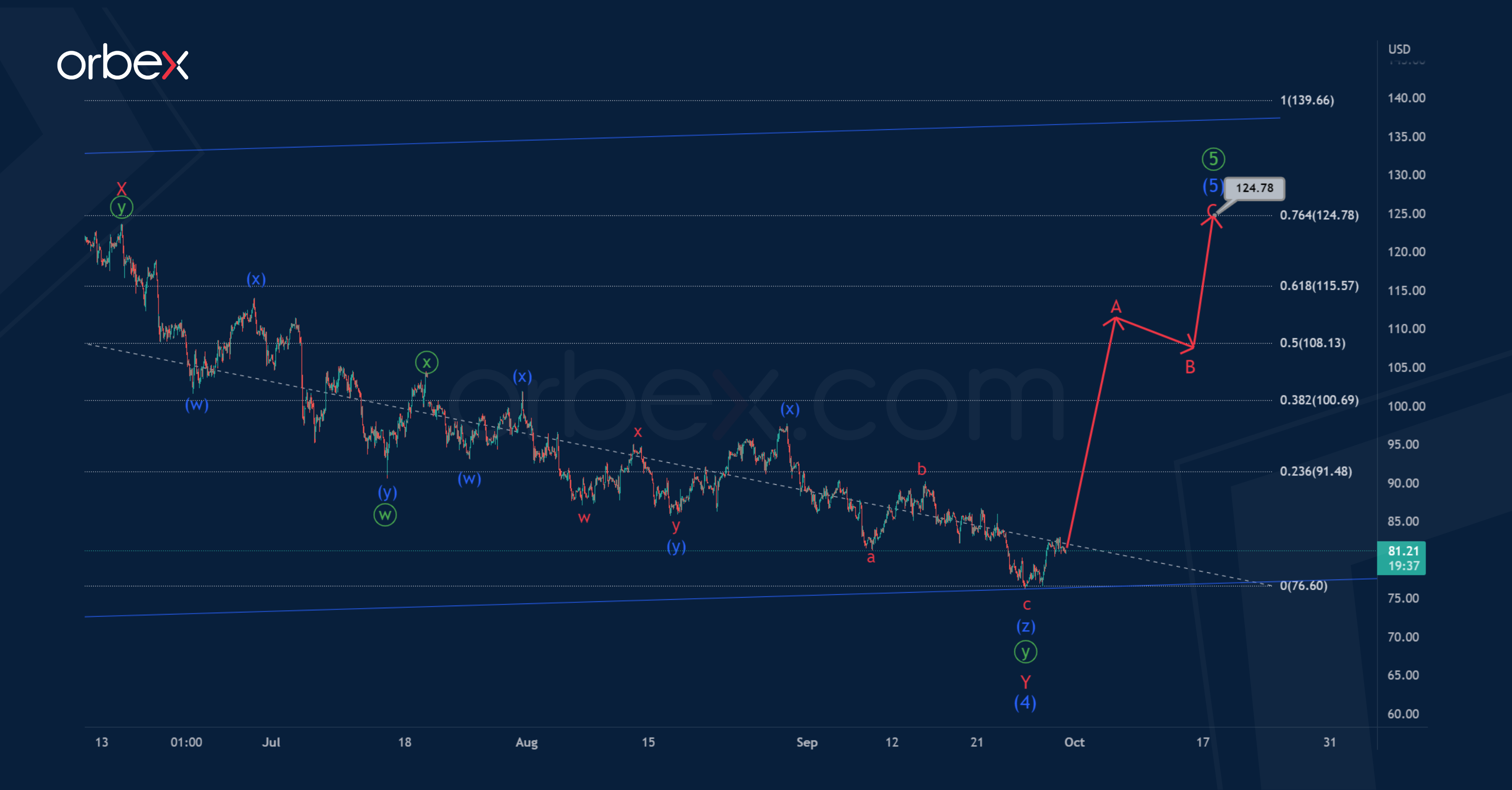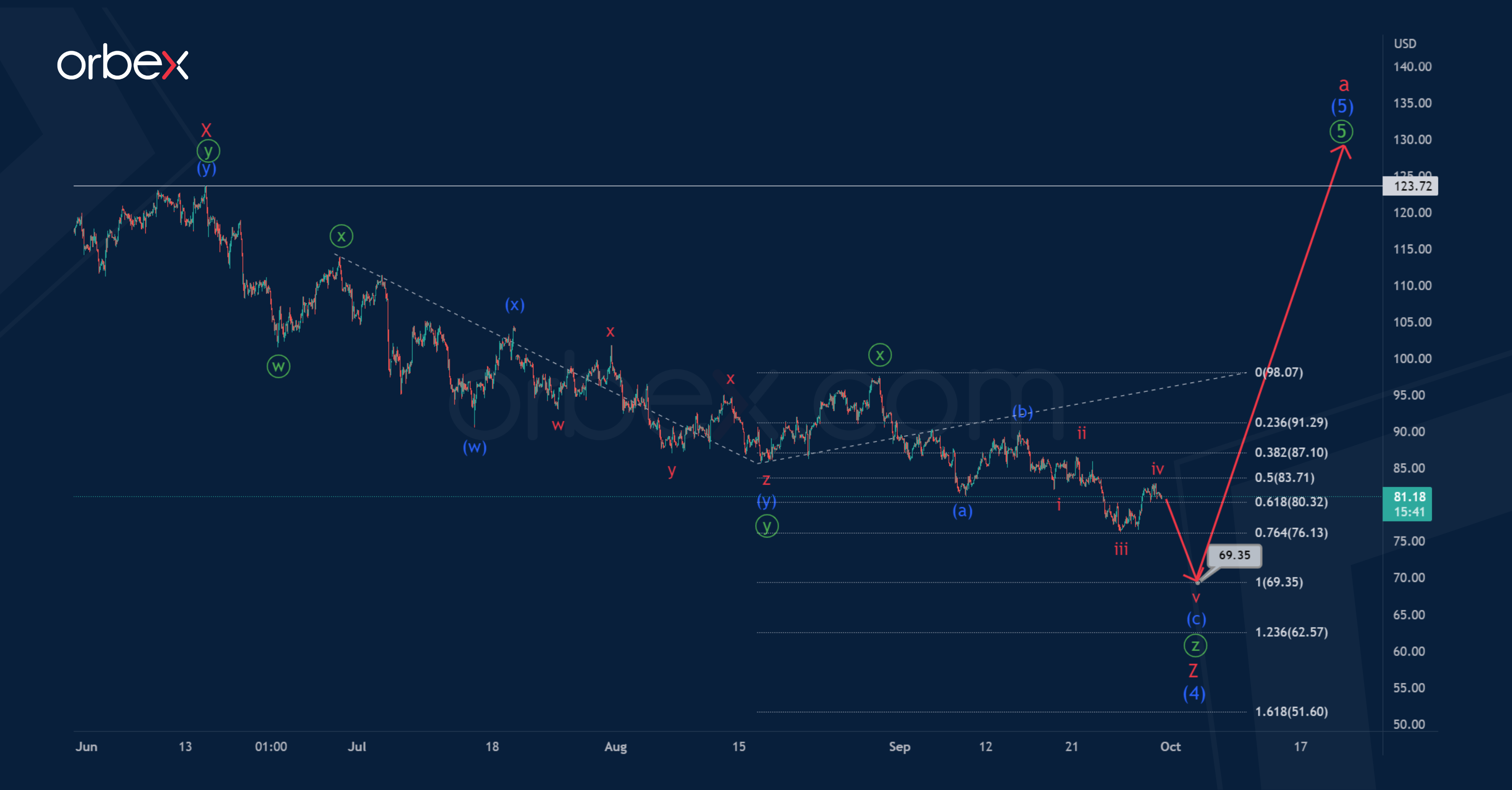 The oil price could fall to 69.35. At that level, minute waves ⓨ and ⓩ will be equal.