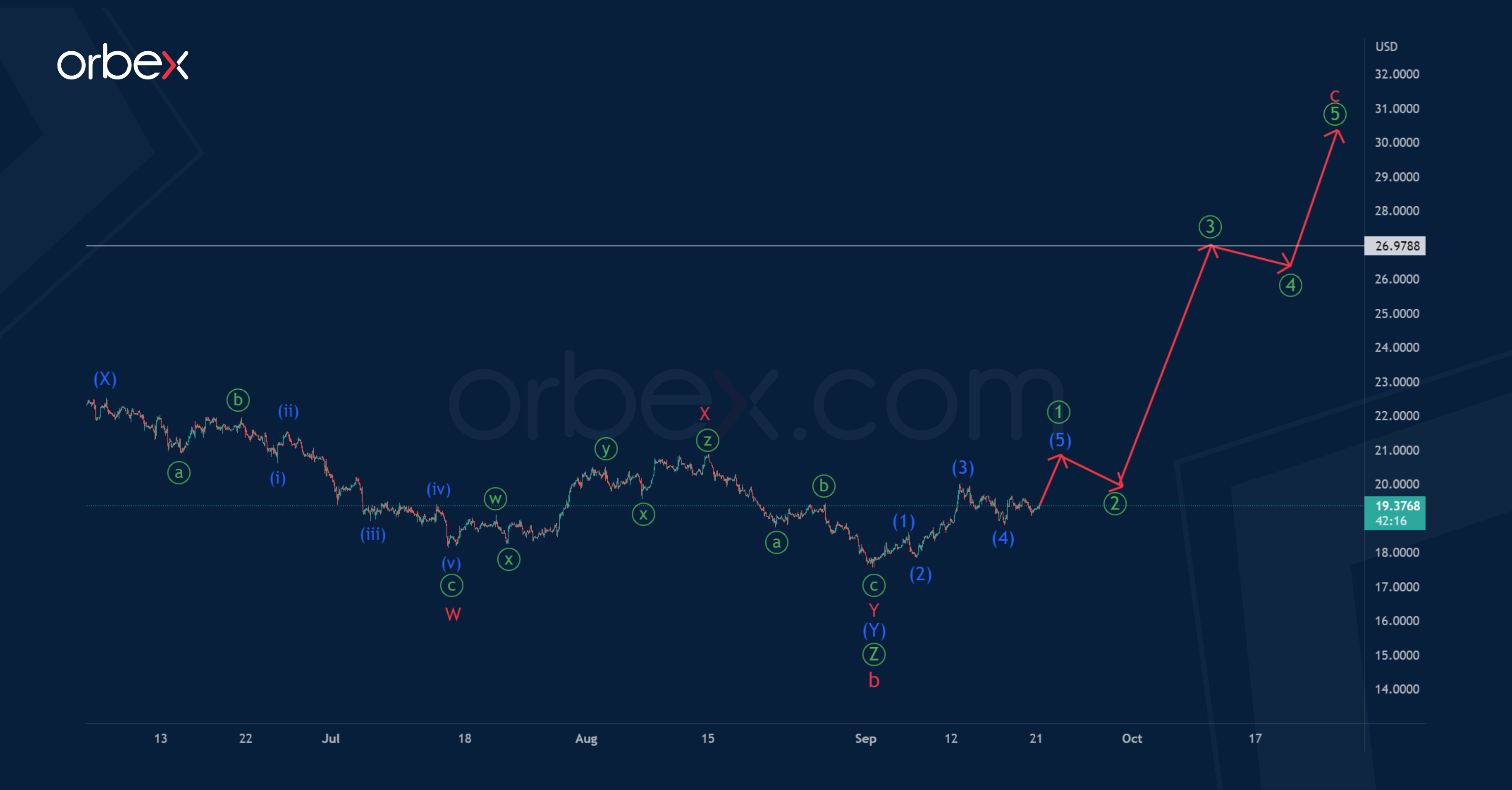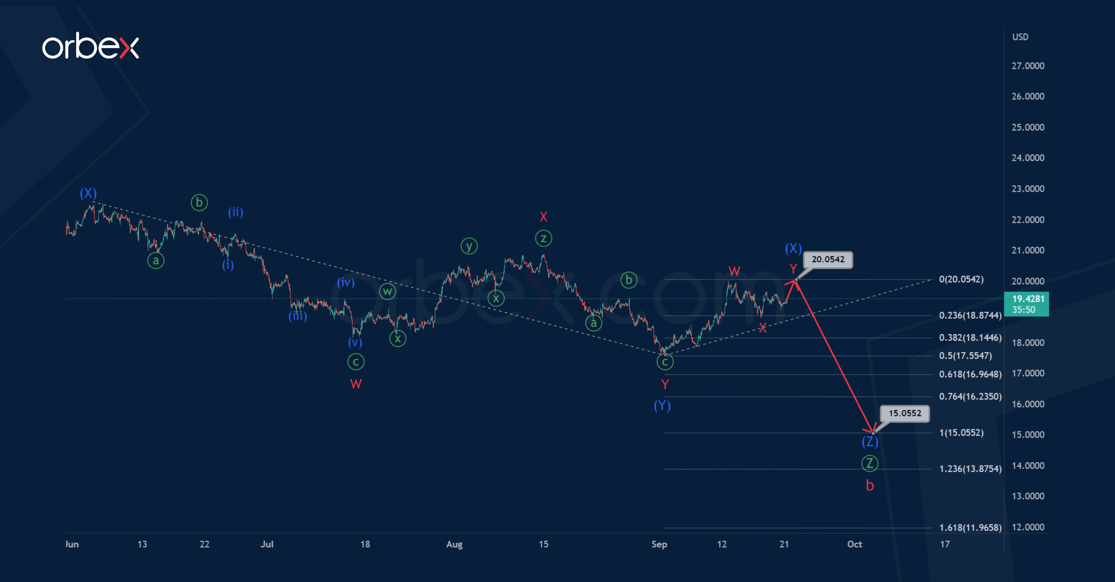 Most likely, the wave Ⓩ will be an intermediate triple zigzag (W)-(X)-(Y)-(X)-(Z). In this pattern, wave (X) is likely to end in the form of a minor double zigzag W-X-Y to 20.054. At that level, it will be at 50% along the Fibonacci lines of sub-wave (Y).