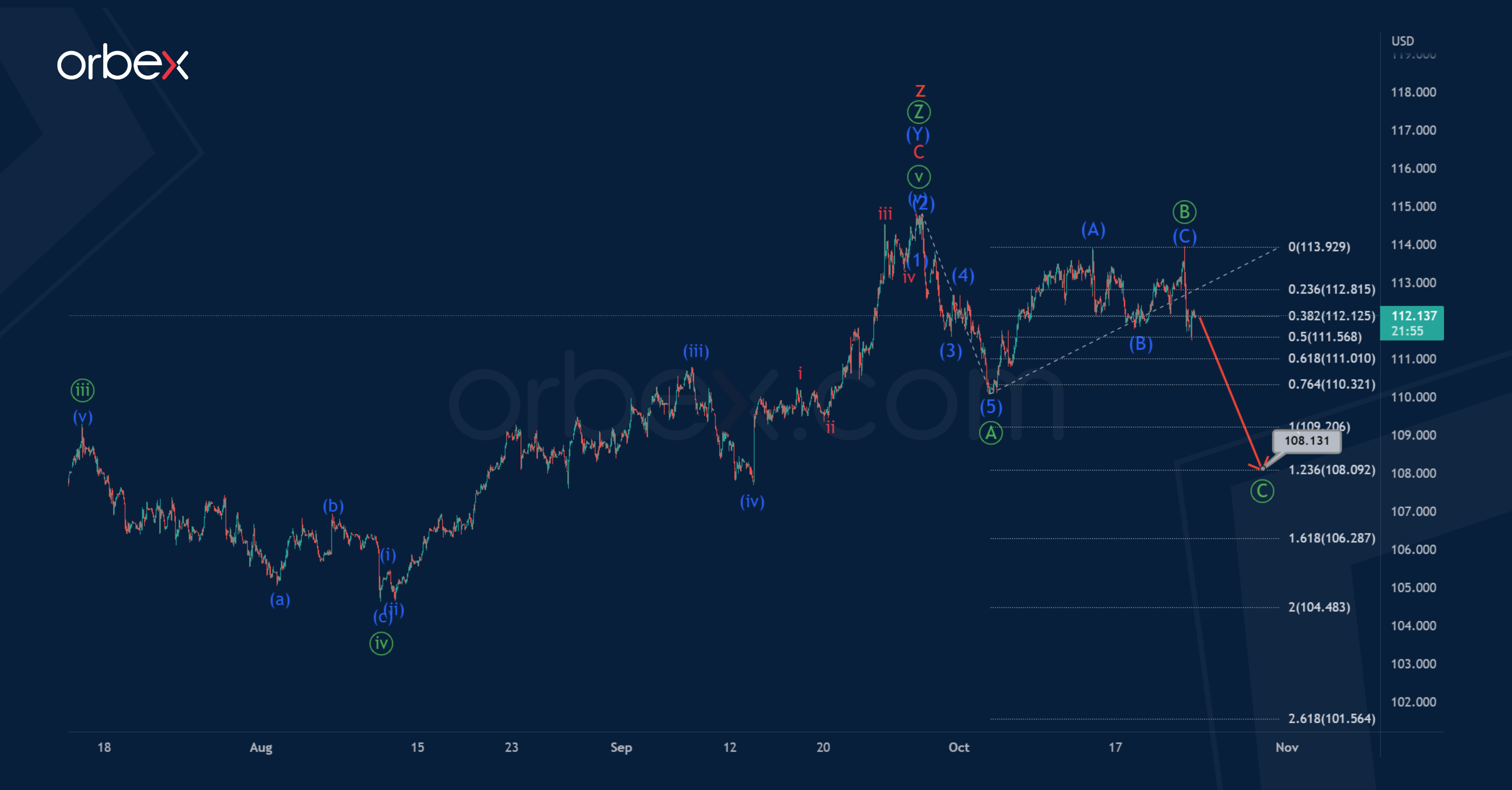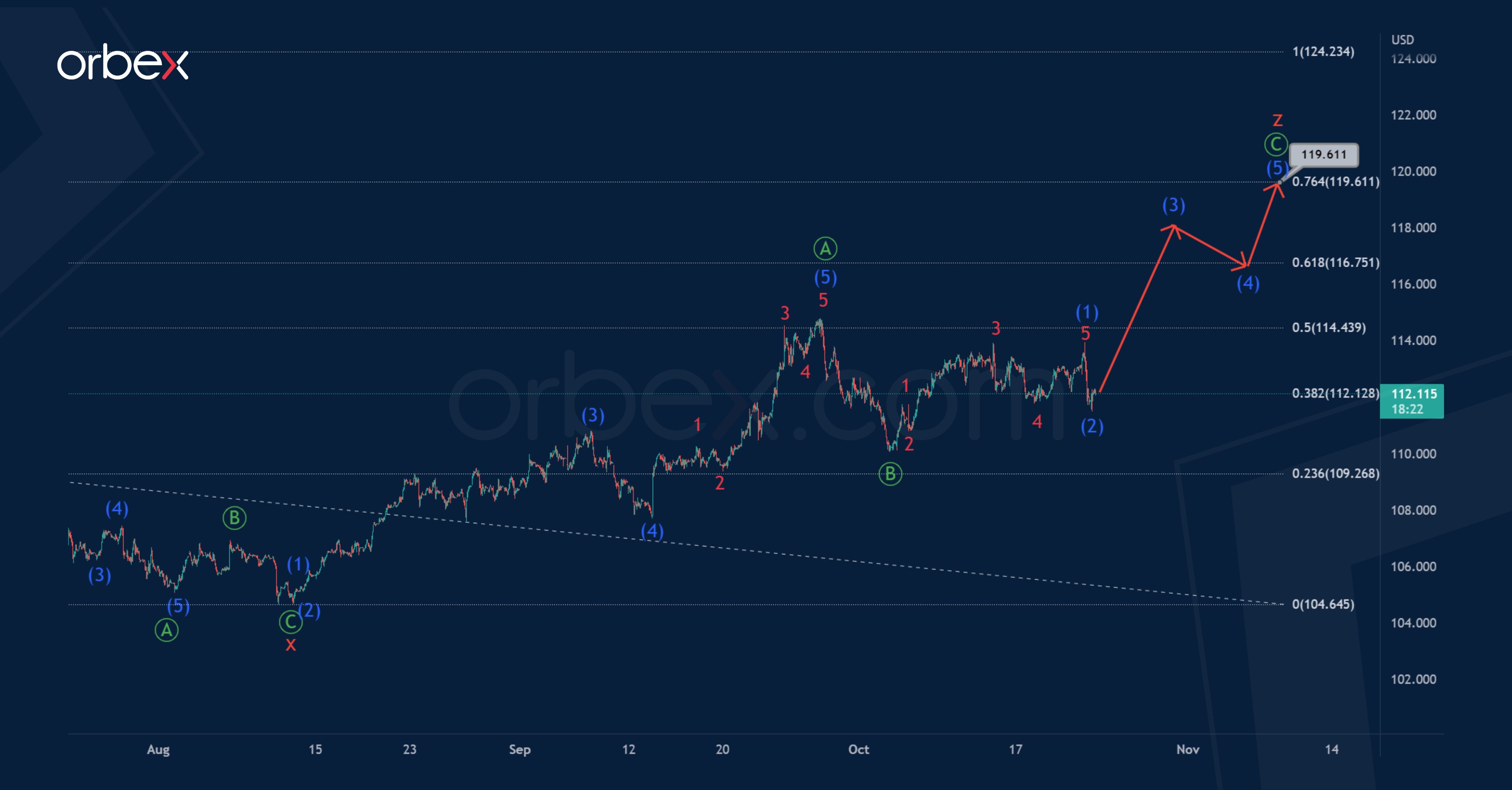 The entire wave z could end near 119.61. At that level, it will be at the 76.4% Fibonacci extension of wave y.