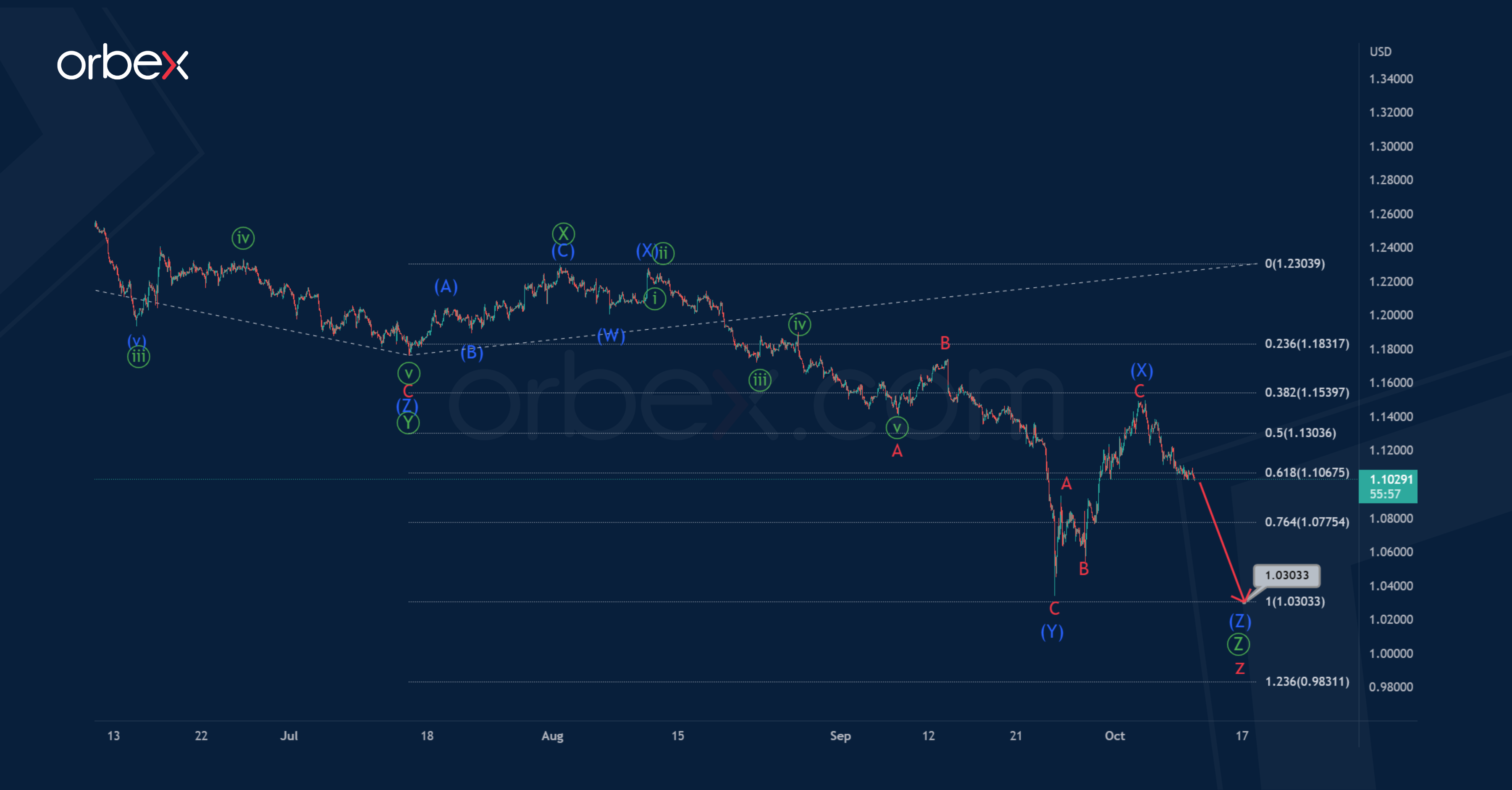 After that, we saw the continuation of the bearish trend in the primary wave Ⓩ. This could complete its intermediate triple zigzag pattern (W)-(X)-(Y)-(X)-(Z) near the 1.030 mark.
