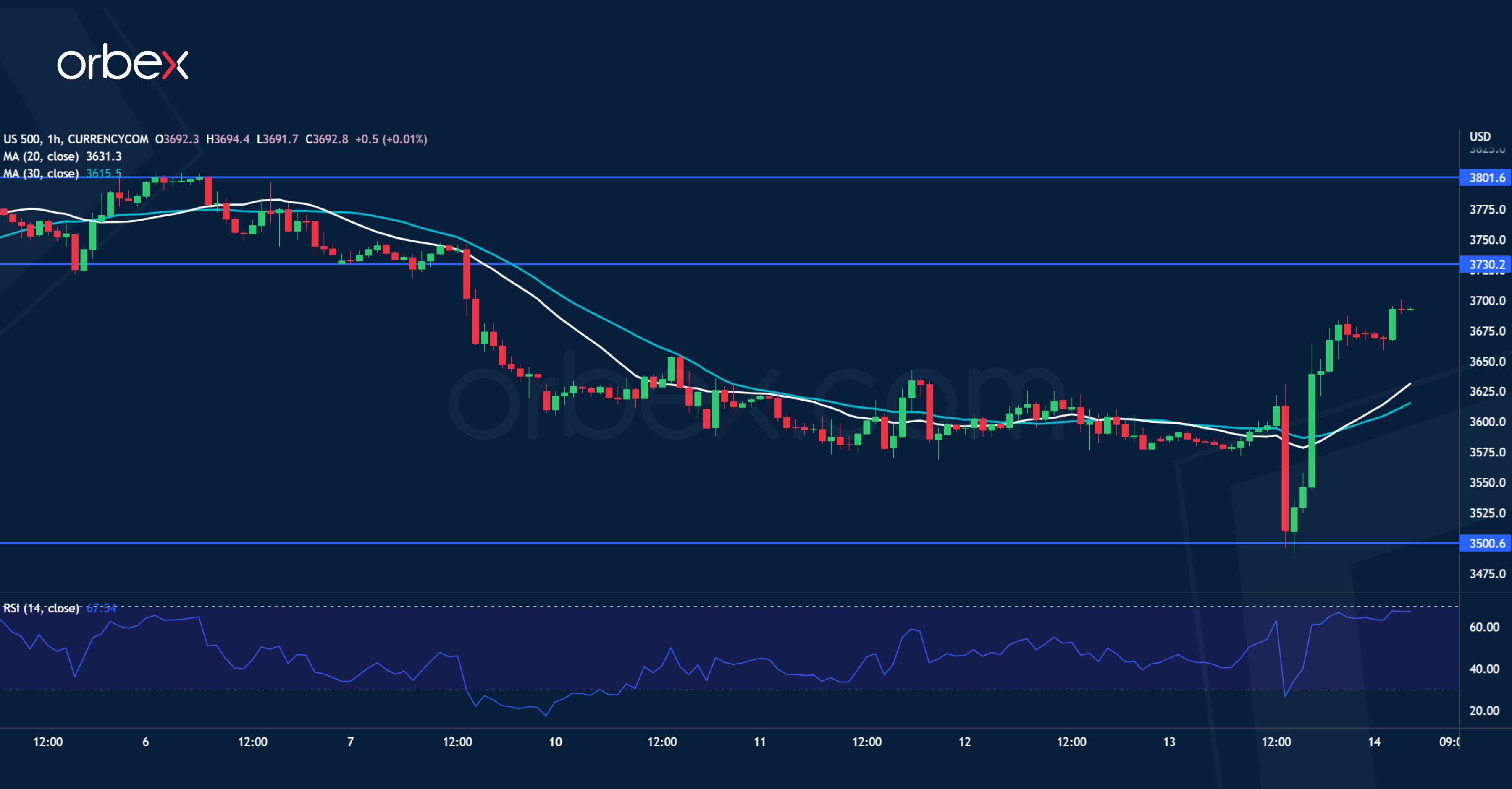 The S&P 500 shot up as a hot CPI reading had previously been priced in. The index has given up all previous gains after it came to a halt at 3800. The supply area may have been the last chance to get out for those who bought the dips last summer. This also means that there could be more room on the downside. In the meantime, 3500 at the base of a bullish breakout in November 2020 saw an inflow of buying interests. A pop above 3630 may prompt more intraday sellers to cover and 3730 is the next resistance.