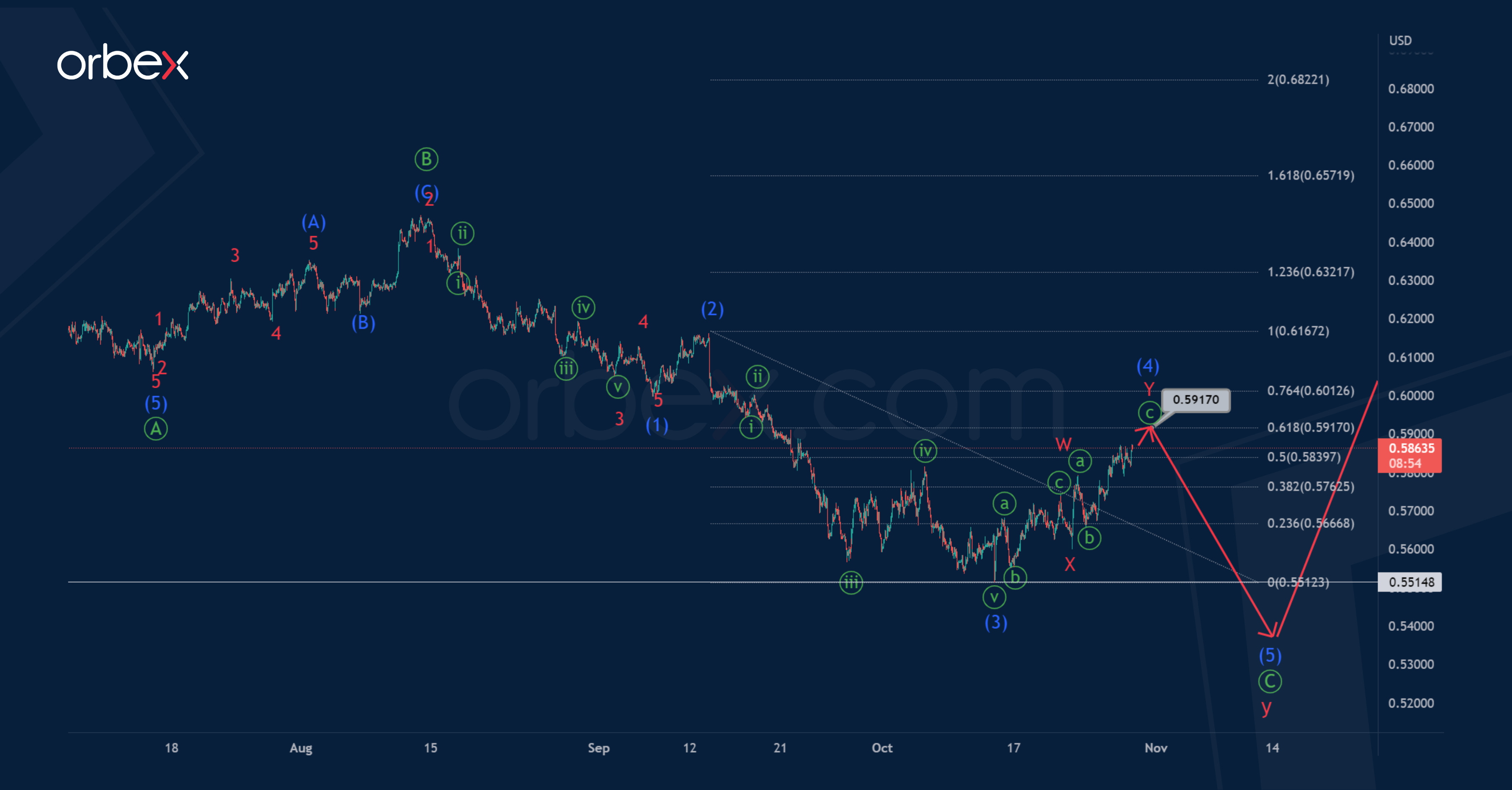 Then the currency is expected to fall to a minimum of 0.551 in the intermediate wave (5).
