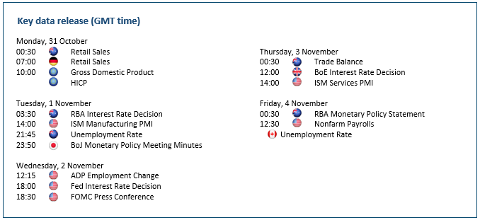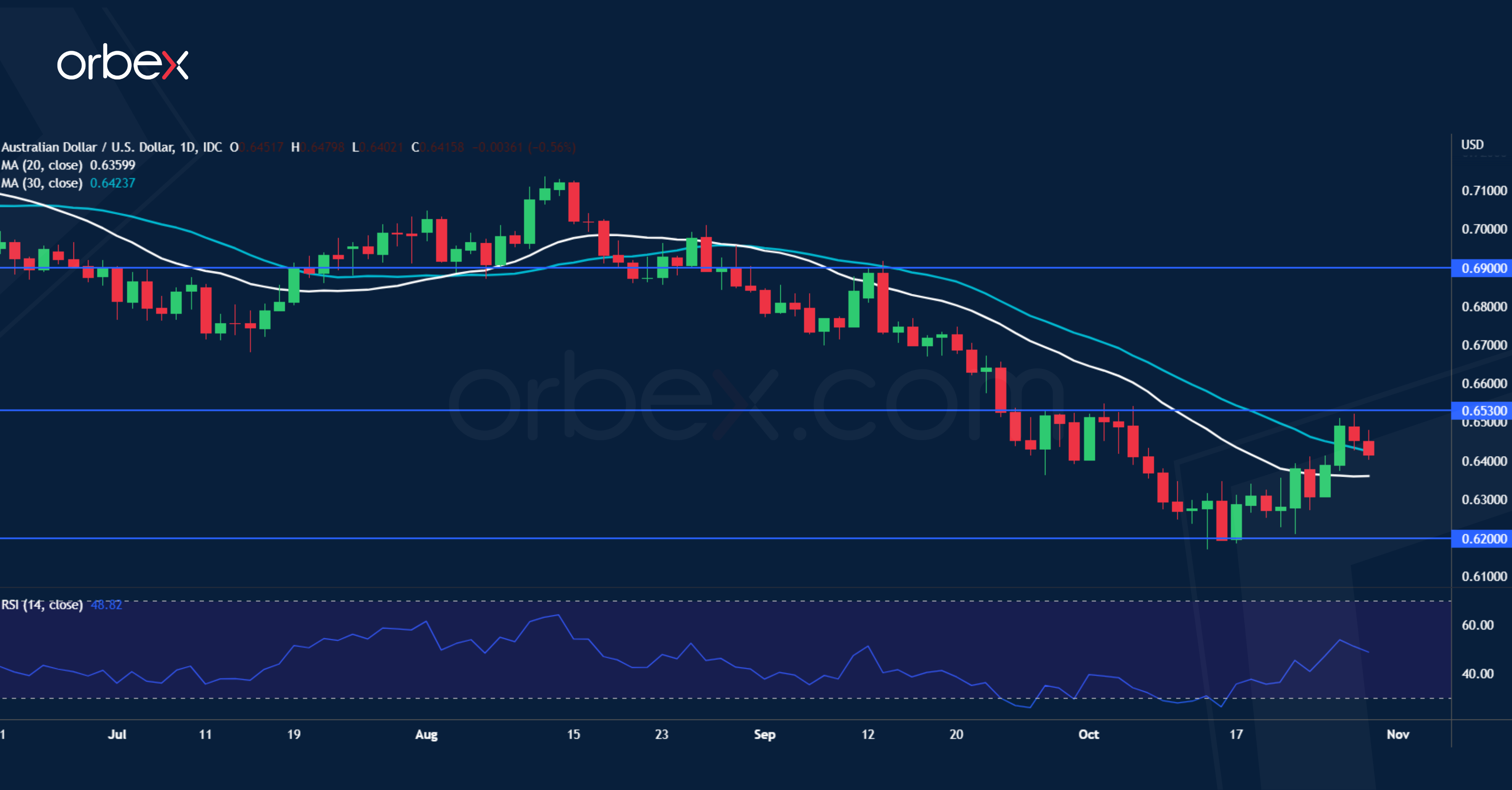 The Australian dollar slips as the RBA may continue to reduce the pace of monetary normalisation. The recent bounce has more to do with a pullback in the US dollar rather than a shift in sentiment. The RBA is expected to lift its feet off the pedal with another 25 basis points hike this week. However, as inflation reaches a 32-year high, policymakers are under pressure to stay assertive. The upside risk would be a 50bp hike. Still, the contrast with the US Fed, which might deliver a fourth consecutive 75 bp rate hike in November, could keep the aussie subdued and under 0.6530. A fall below 0.6200 would lead to 0.6000.