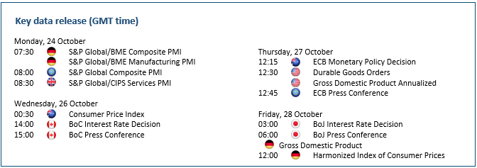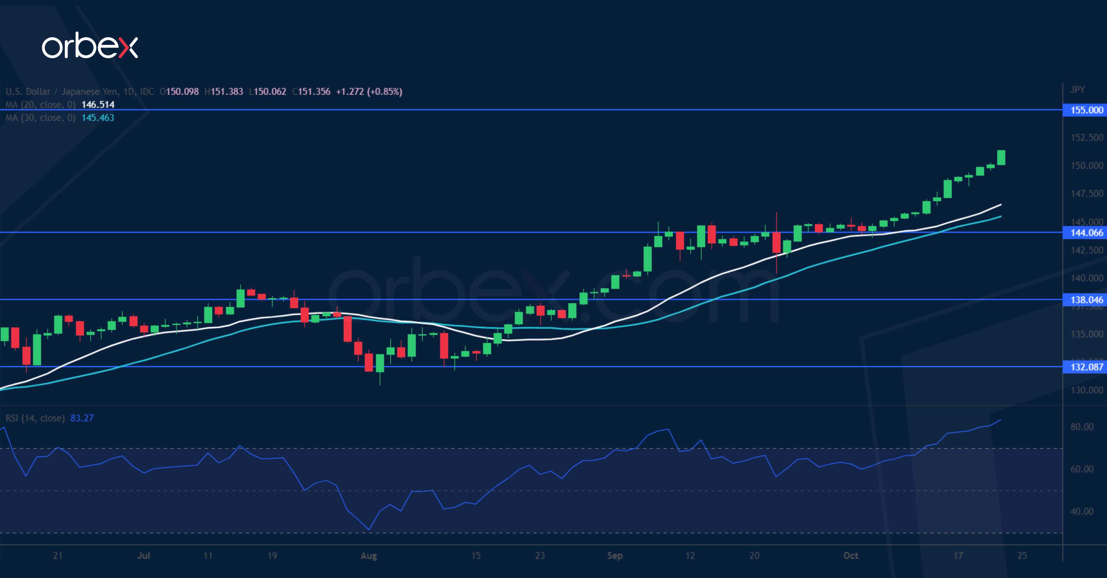 The Japanese yen weakens as quantitative tightening remains a remote prospect. As its currency sank to a 32-year low, the Bank of Japan’s ultra-loose monetary policy has become increasingly at odds with the finance ministry’s view. The central bank may still deem it premature to shift away from the status quo given heightened global uncertainties. The latter, however, concerned by the yen’s unidirectional slide and its negative impacts on corporations, may choose to intervene in the market again, popping up short-term market moves. The greenback is heading towards 155.00 with 144.00 as the closest support.