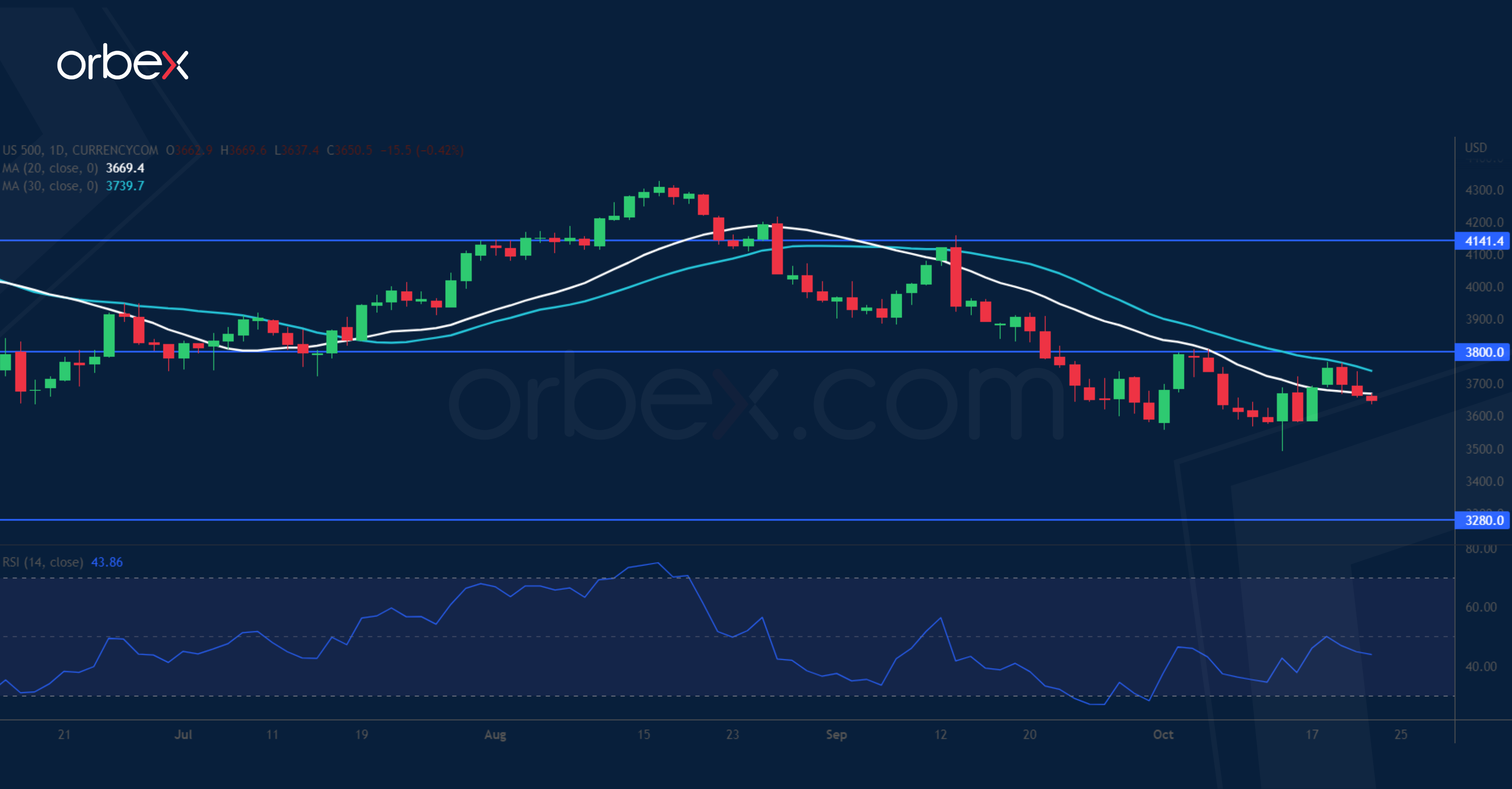 The S&P 500 slides as investors refrain from adding risk. Upbeat quarterly earnings offer stocks limited support as bearish sentiment continues to drive the price action. Hawkish comments from Fed officials mirror strong US job data and high inflation, reinforcing expectations the central bank will not divert from its aggressive path. With cash offering historic risk-free returns these days, most investors would like to see signs inflation is slowing down before jumping in with both feet. Until then, sporadic rallies would only feed the bears. The index may tank to a two-year low at 3280 with 3800 as the immediate resistance.