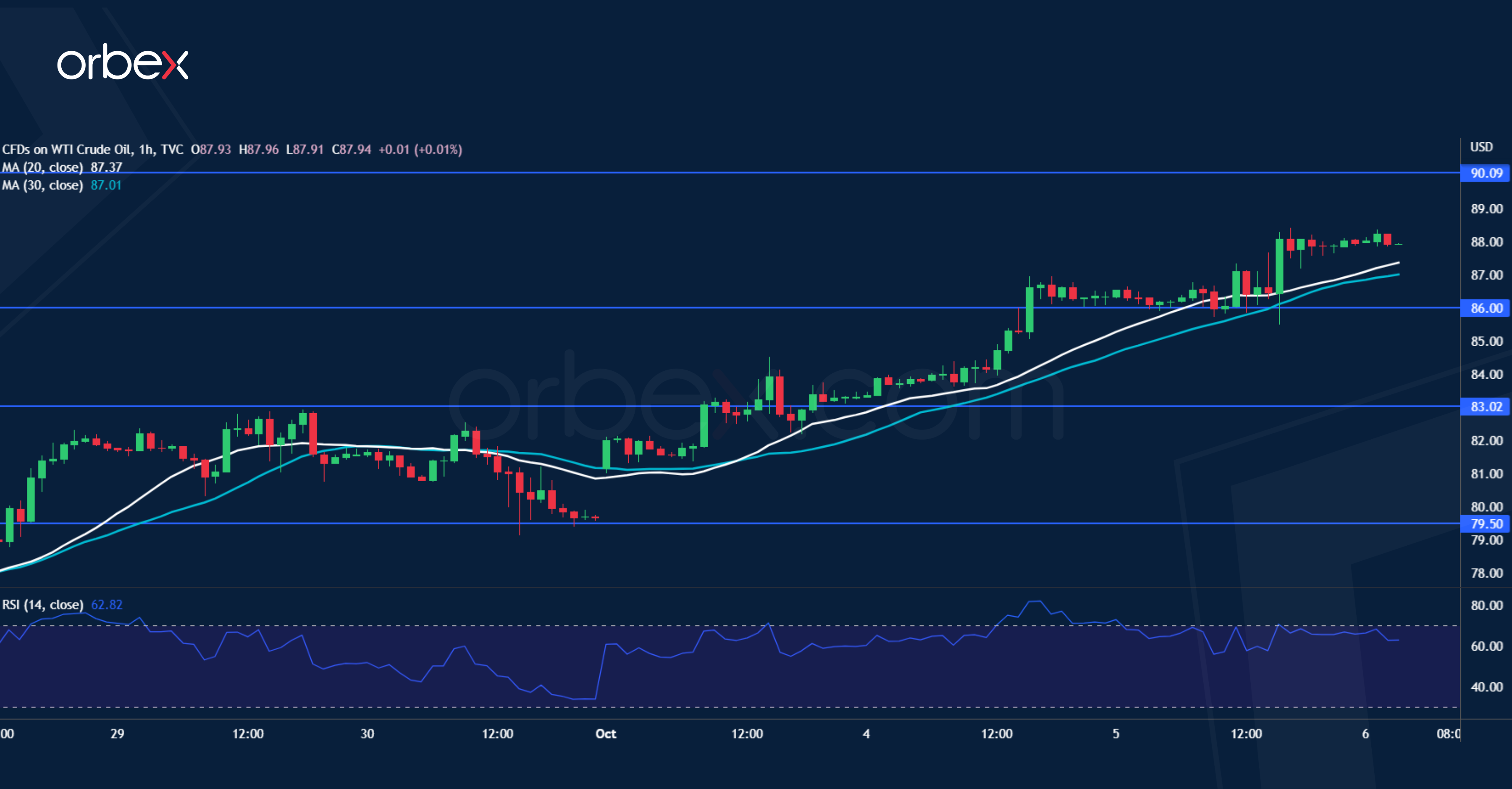 WTI crude bounced higher after OPEC+ agreed to cut output. The rebound has gained a foothold after it cleared the supply zone around 83.00. The price is testing the daily resistance and psychological level of 90.00 and stiff pressure could be expected from the sell side. However, sentiment may brighten up in the short-term if the bulls manage to push past this ceiling, clearing the path towards 97.00. As the RSI inches back into overbought territory, 86.00 has turned into a support in case of a pullback.