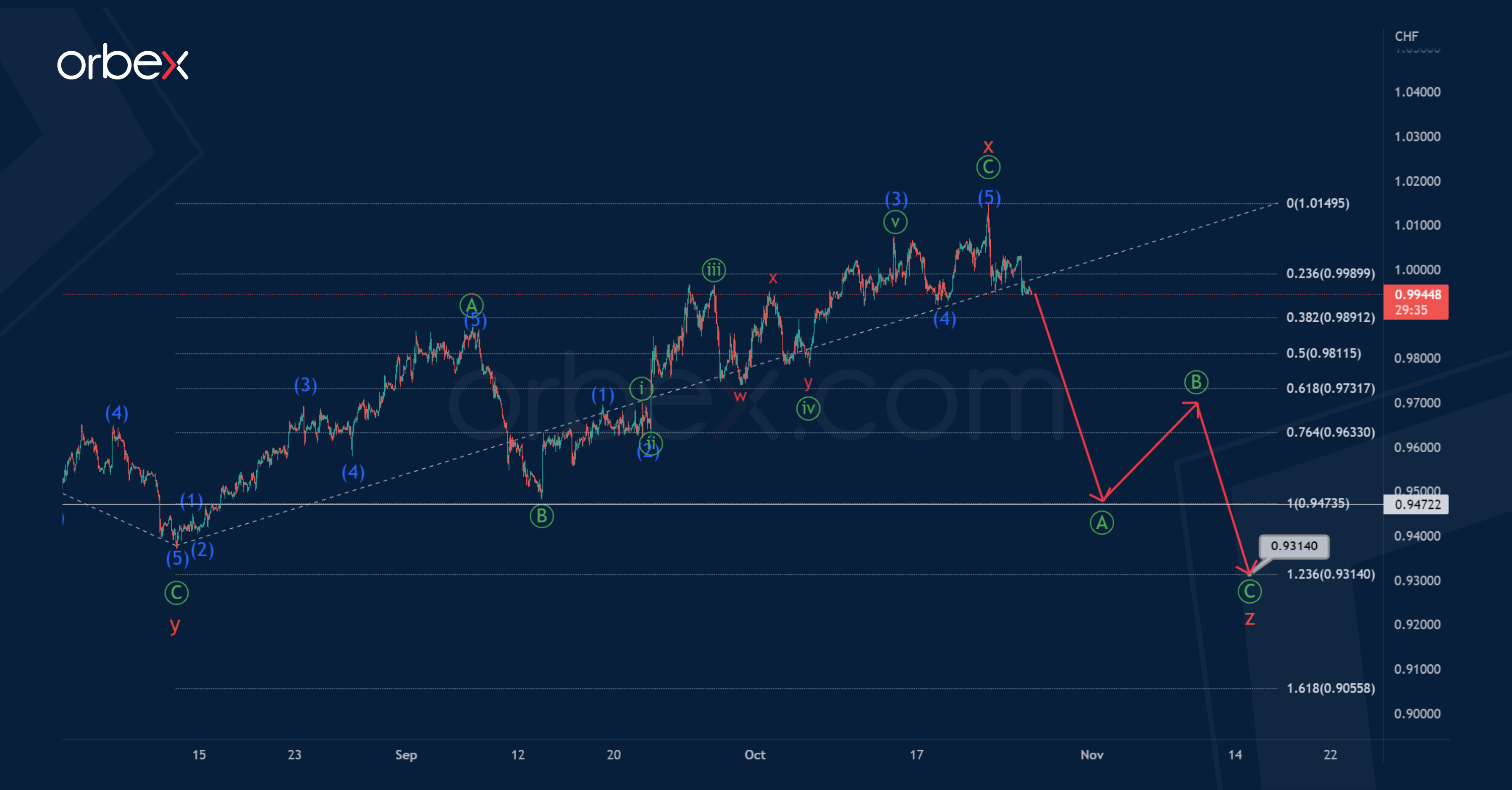 It is possible that the wave z will be at 123.6% of wave y and will end its pattern near 0.931. The first primary sub-wave Ⓐ could end at a minimum of 0.947.