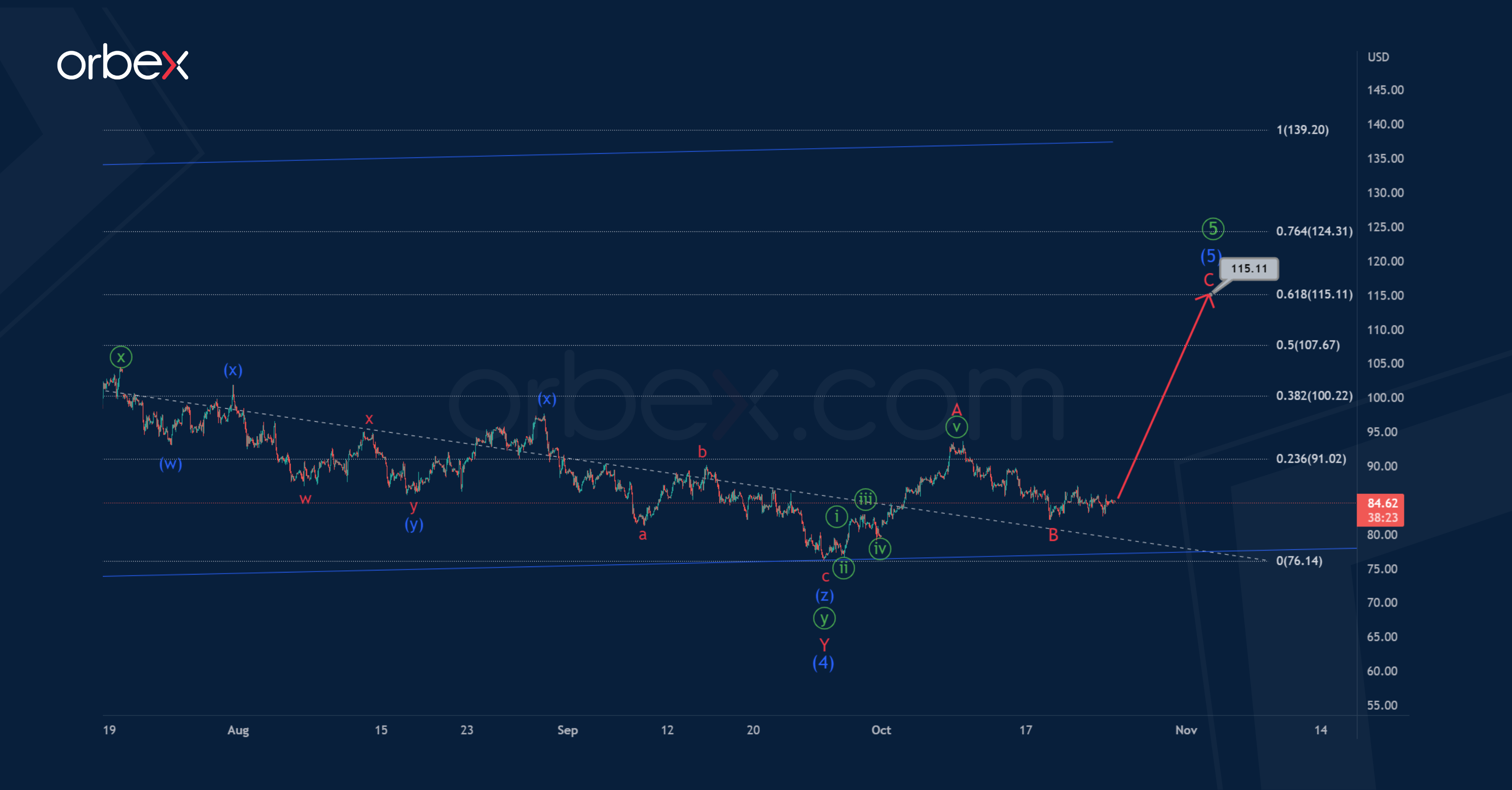 The oil price could fall to 69.50, at which the minute waves ⓨ and ⓩ will be equal.