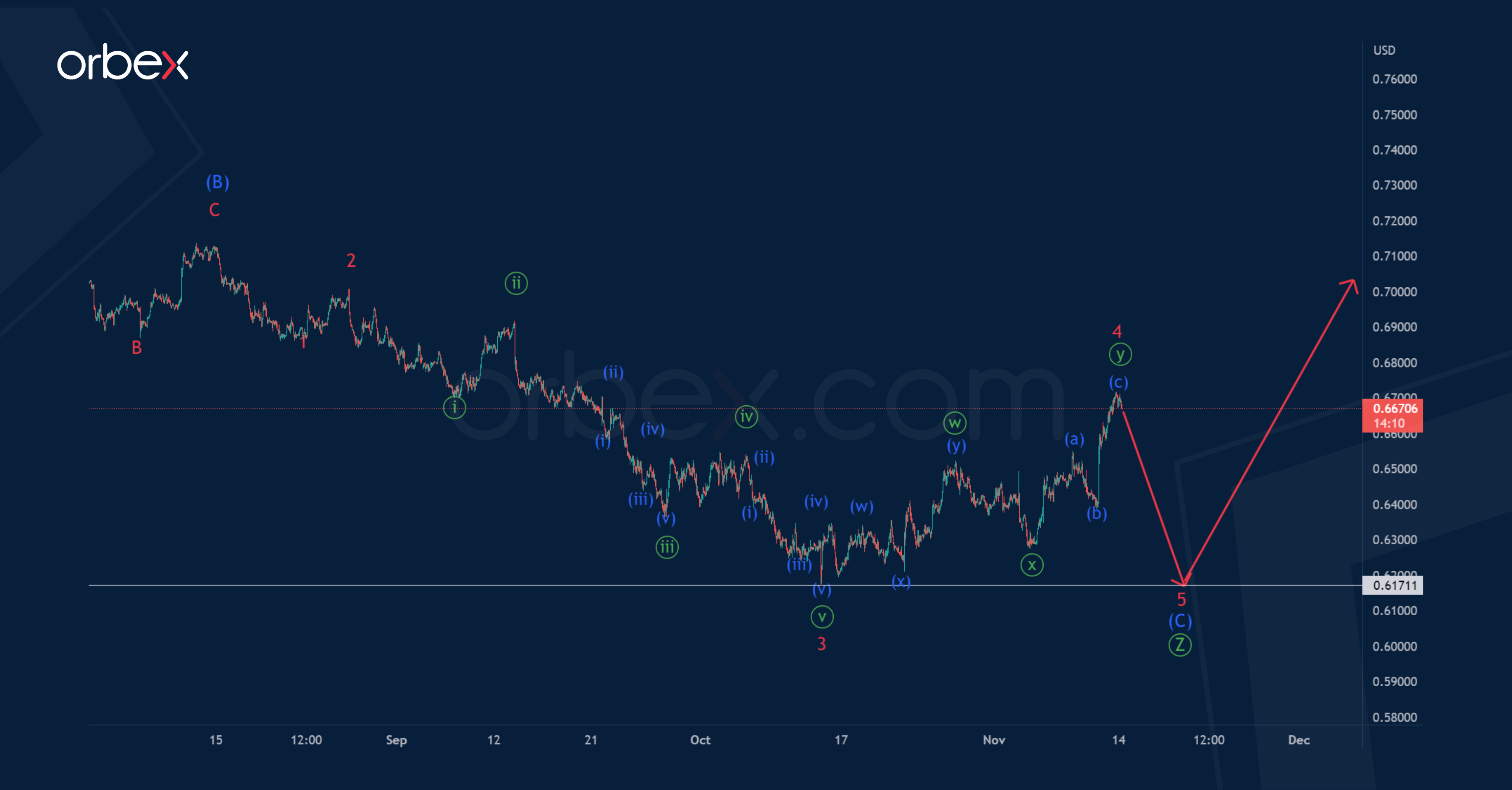In the long term, AUDUSD seems to be forming a bearish triple zigzag Ⓦ-Ⓧ-Ⓨ-Ⓧ-Ⓩ. The primary wave Ⓩ is a simple zigzag (A)-(B)-(C). The intermediate wave (B) of this zigzag took the form of a simple bullish zigzag A-B-C.