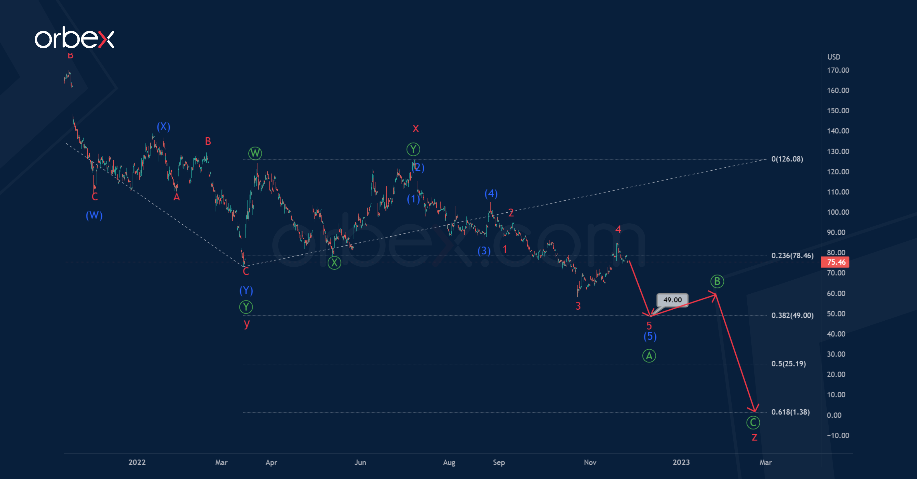 The primary wave Ⓐ has the form of an impulse (1)-(2)-(3)-(4)-(5). Its end is expected near 49.00. At that level, unfinished wave z will be at 38.2% of wave y.