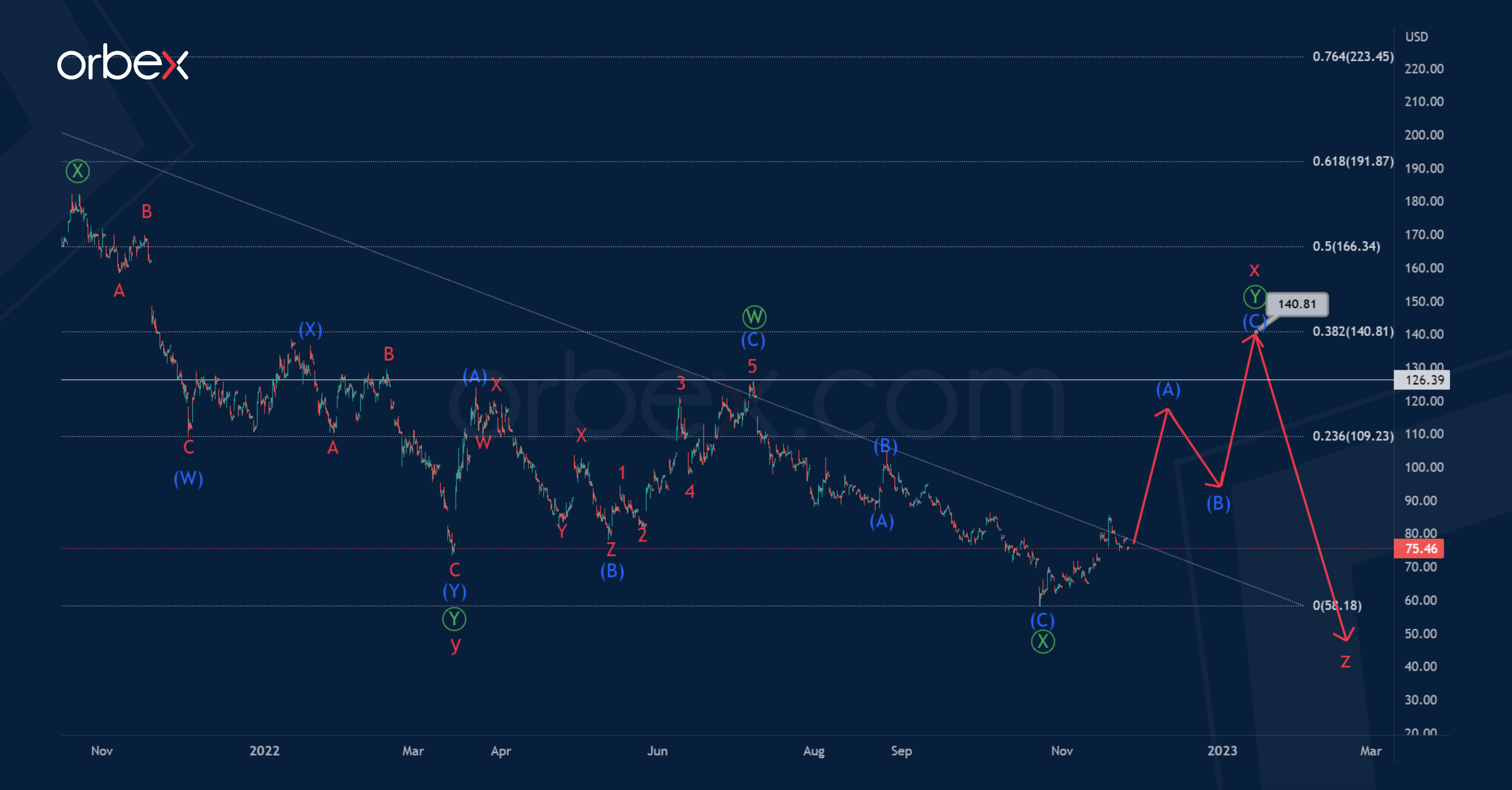 The BABA structure hints at a bearish corrective trend taking the form of a cycle triple zigzag w-x-y-x-z.