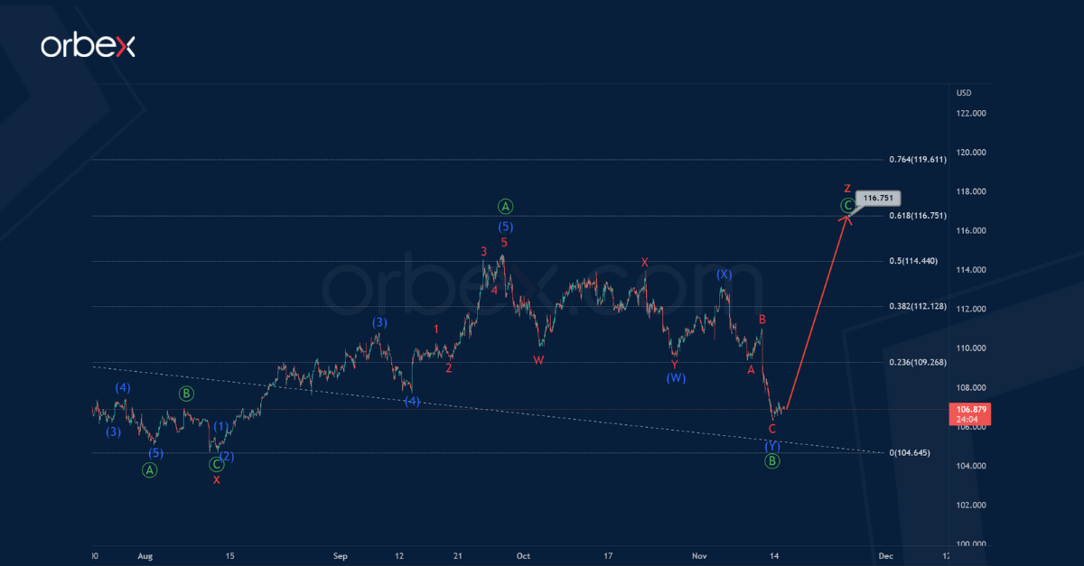 Most likely, at the level of 104.64, the bearish cycle wave x was completed. This took the form of a standard zigzag Ⓐ-Ⓑ-Ⓒ of the primary degree. After that, an upward impulse price movement in the wave z began.