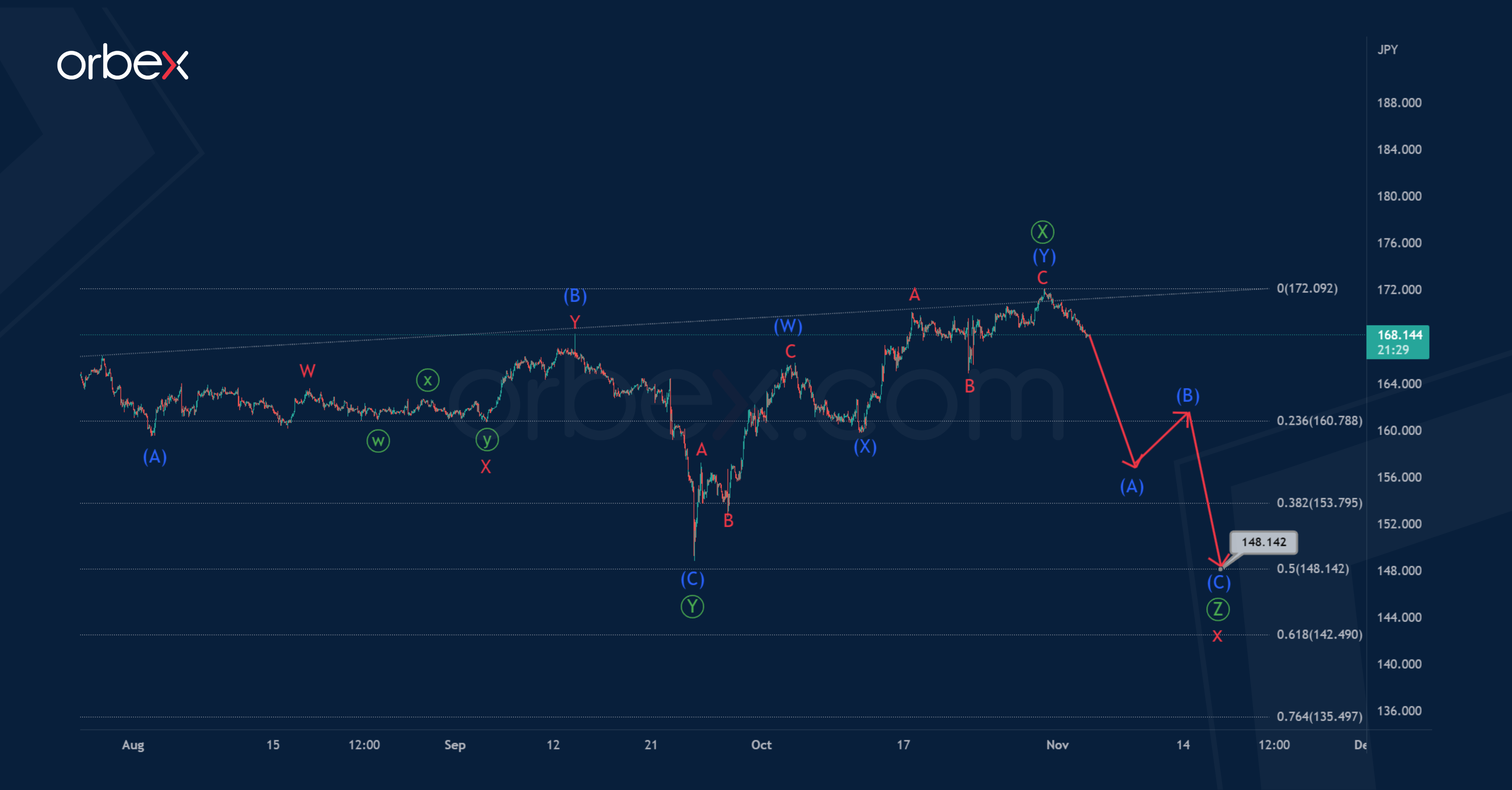 Perhaps in the near future, the market will fall in the last wave Ⓩ to 148.14. At that level, wave x will be at 50% along the Fibonacci lines of actionary wave y.