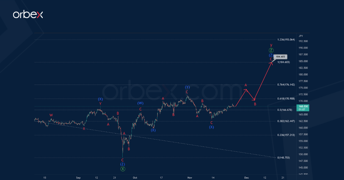 The sub-waves Ⓦ-Ⓧ-Ⓨ-Ⓧ are fully completed. In the near future, prices will fall in the last wave Ⓩ to 148.19. At that level, cycle wave x will be at 50% of actionary wave y.