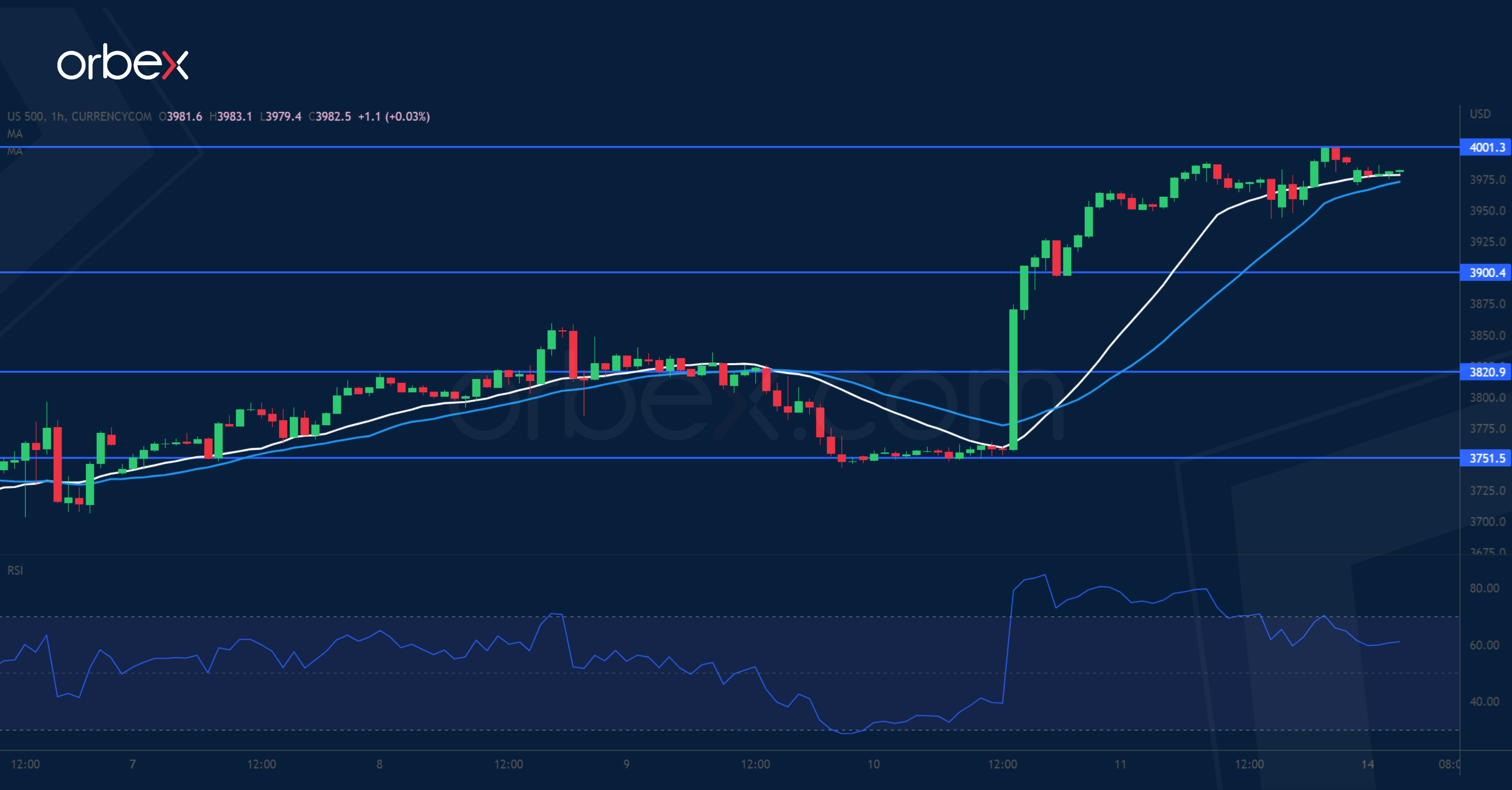 The S&P 500 flies high fuelled by the Fed pivot optimism. The vertical rise above 3900 confirms the bullish MA cross on the daily chart, suggesting an acceleration to the upside. The index is testing the psychological level of 4000, which is also a former support from a mid-September sell-off. A breakout would put the September peak of 4150 within reach. The RSI shows an overextension and may prompt intraday buyers to take profit in the supply zone. The resistance-turn-support at 3900 would be the first level to monitor.