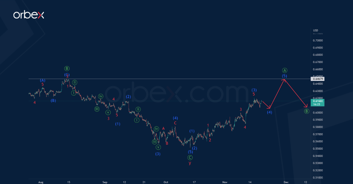 NZDUSD suggests forming a bearish trend, which could take the form of a double zigzag w-x-y of the cycle degree. The current chart shows the structure of the final wave y, which is similar to the primary zigzag Ⓐ-Ⓑ-Ⓒ.