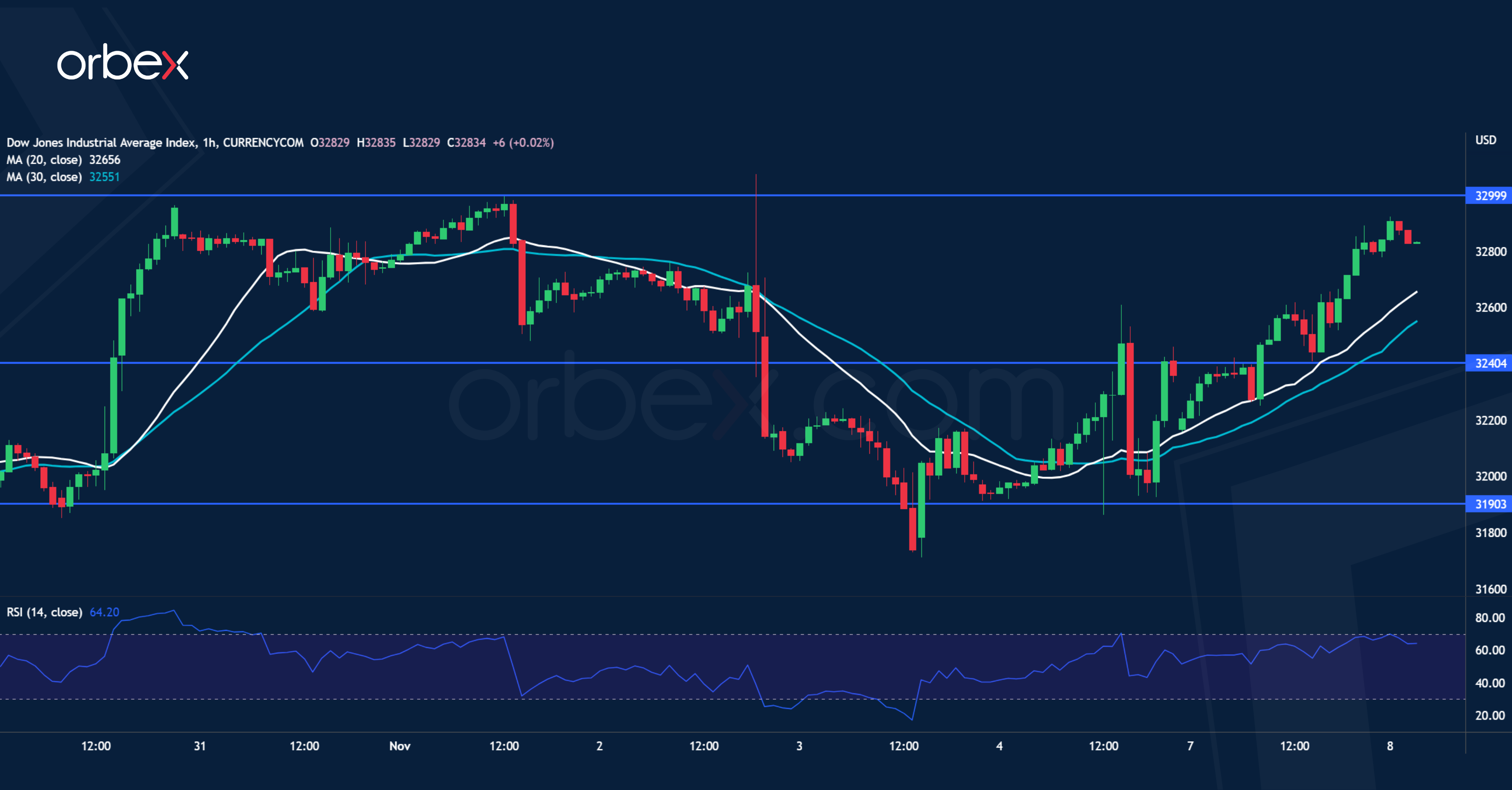 The Dow Jones 30 rallies as Republicans are favoured to win the midterm elections. The index slowed down near 33000, at the start of a sell-off in late August. Profit-taking was not enough to drive the price south, which suggests robust pressure from the buy side. A close above 33000 would shake out remaining selling interests and pave the way for a rally to August’s peak at 34200, which is the boundary between a bear and a bull market. In the meantime, an overbought RSI may limit the upside with 32400 as the closest support.