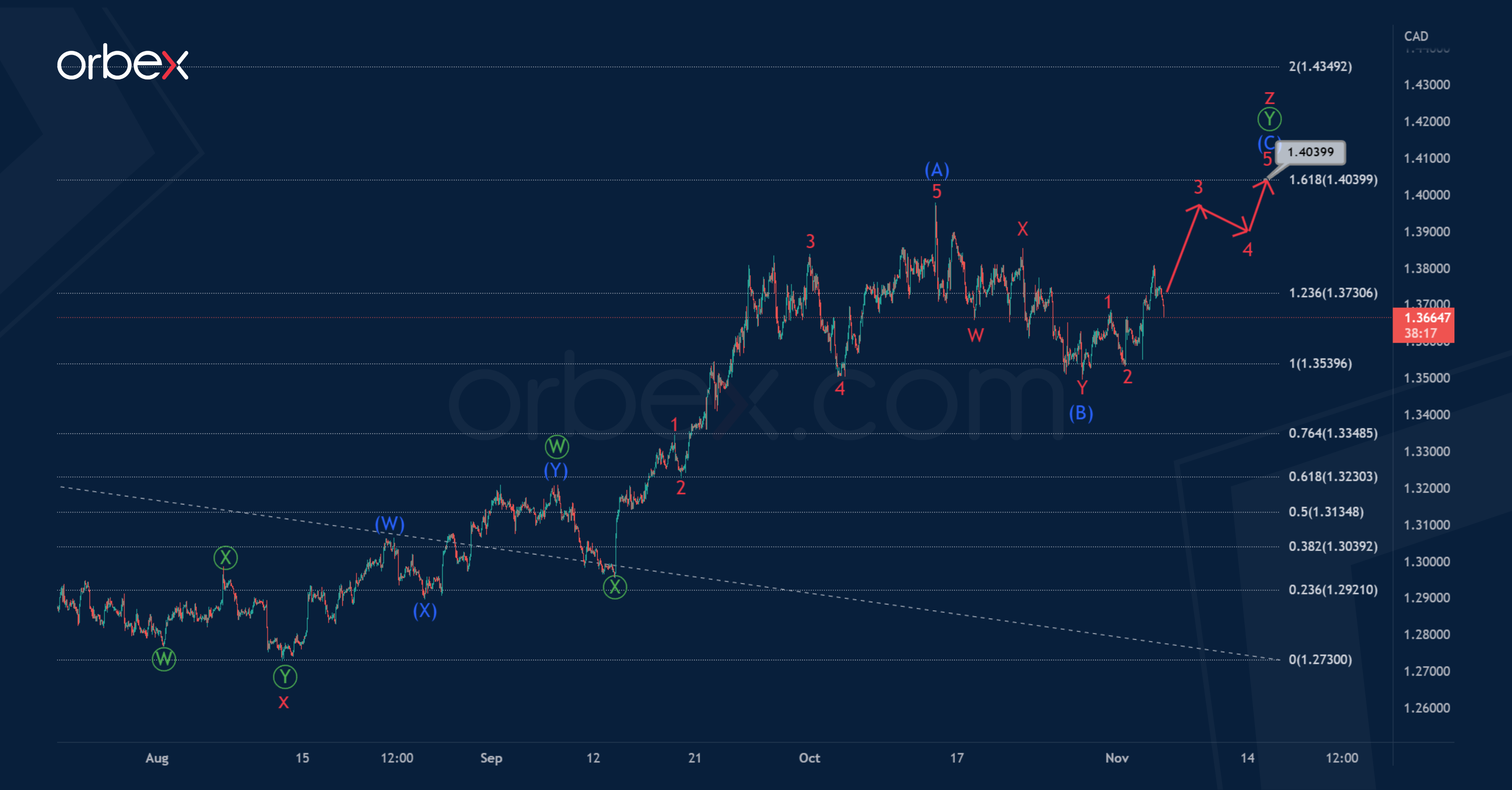 In the near future, we can expect the formation of a bearish primary wave Ⓨ, which could take the standard zigzag shape (A)-(B)-(C) and end near 1.331. At that level, the primary waves Ⓦ and Ⓨ will be equal.