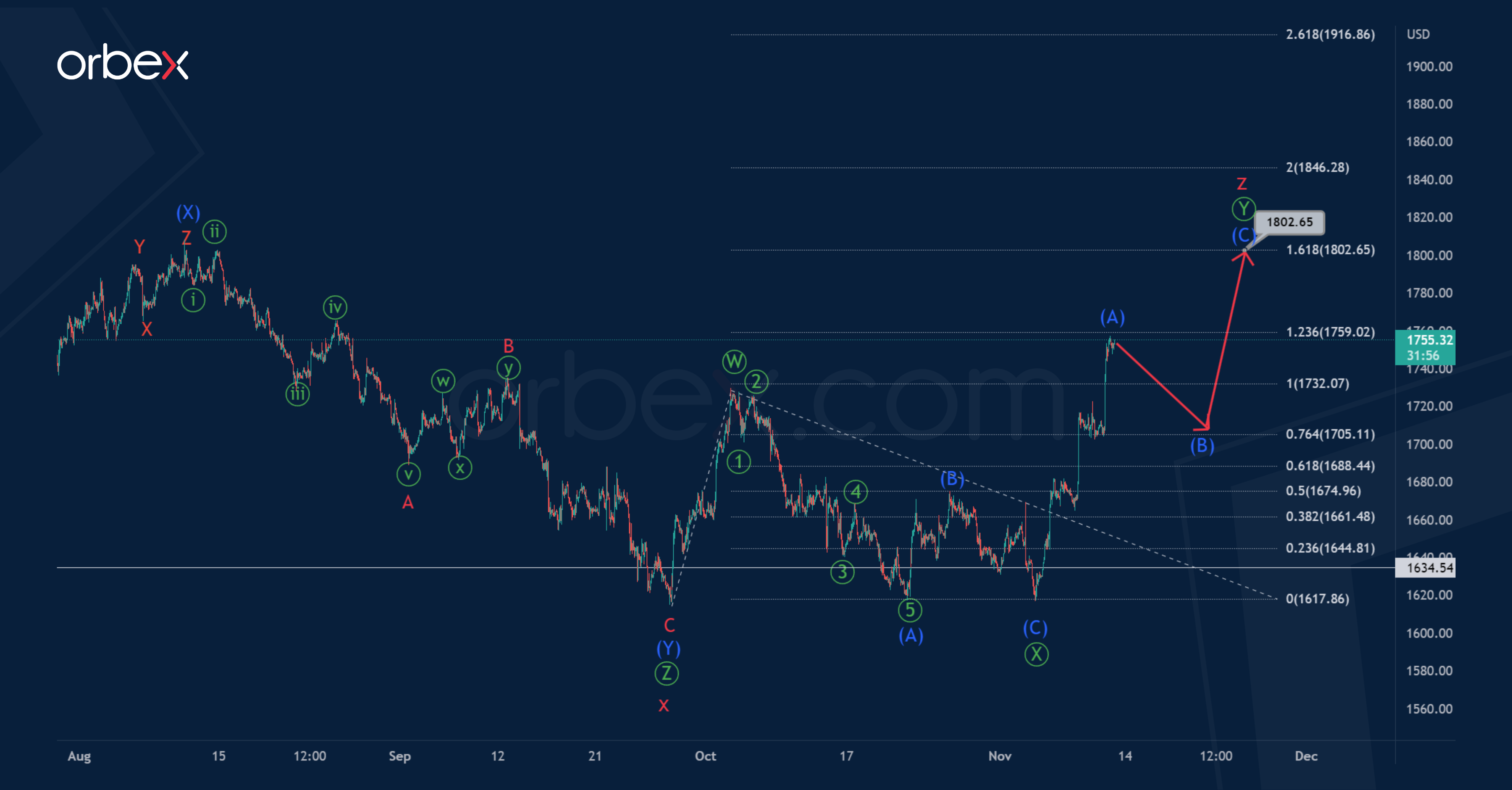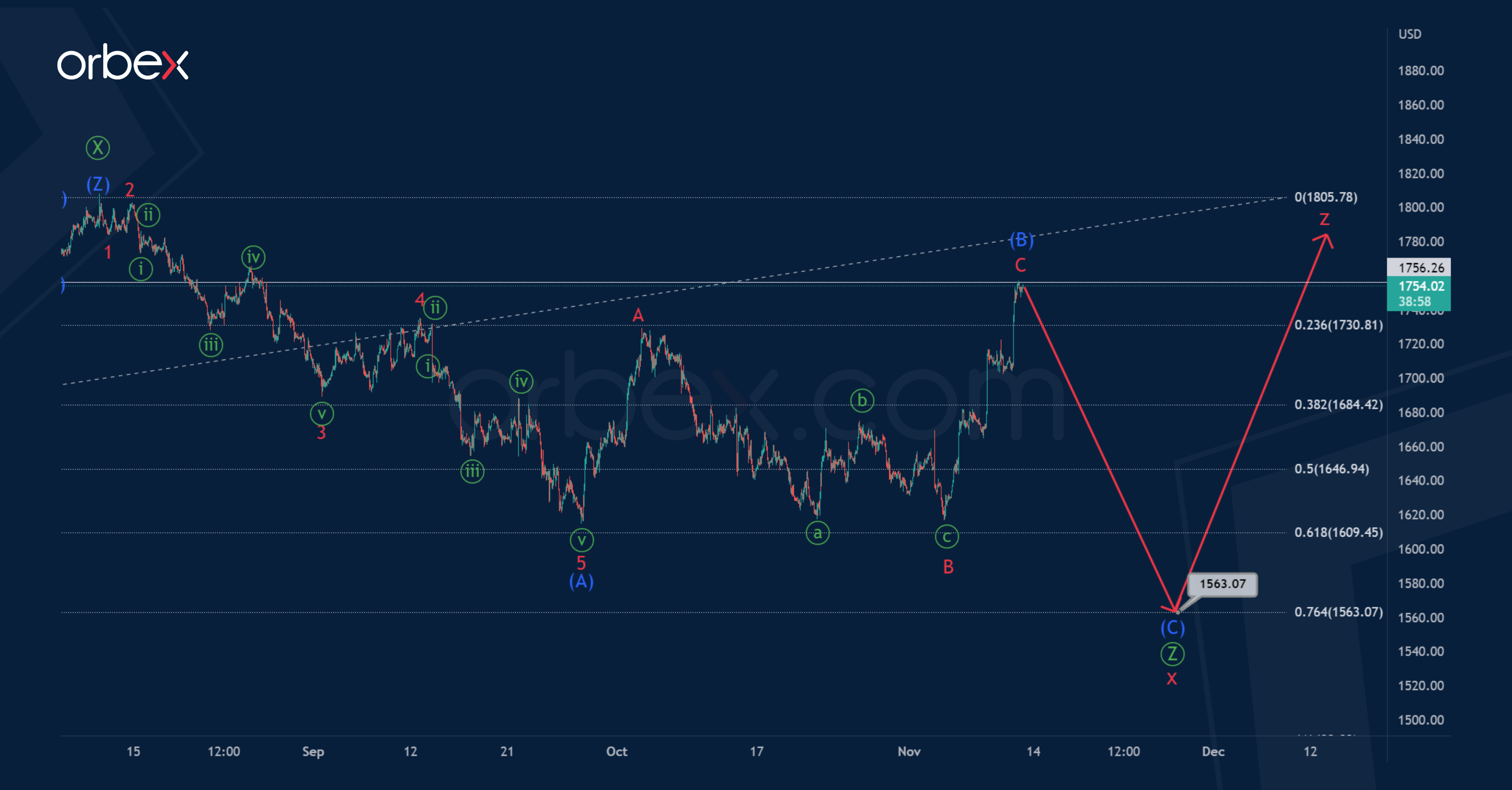 Thus, a downward movement of XAUUSD is likely in the near future. The primary wave Ⓩ could take the form of an intermediate zigzag (A)-(B)-(C).